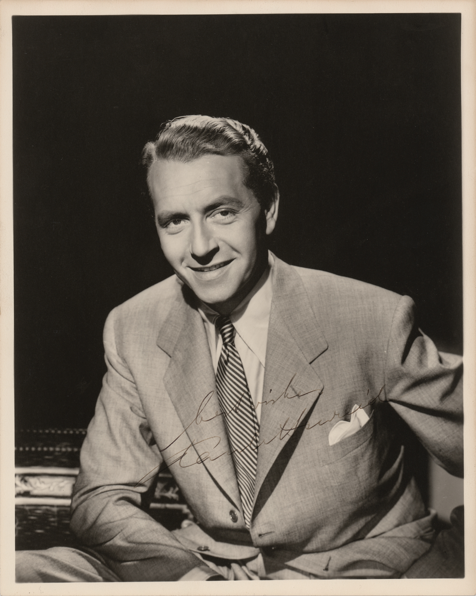 Vintage matte-finish 8 x 10 photo of the Casablanca actor in a suit and tie, signed in fountain pen, "best wishes, Paul Henreid." In very fine condition.