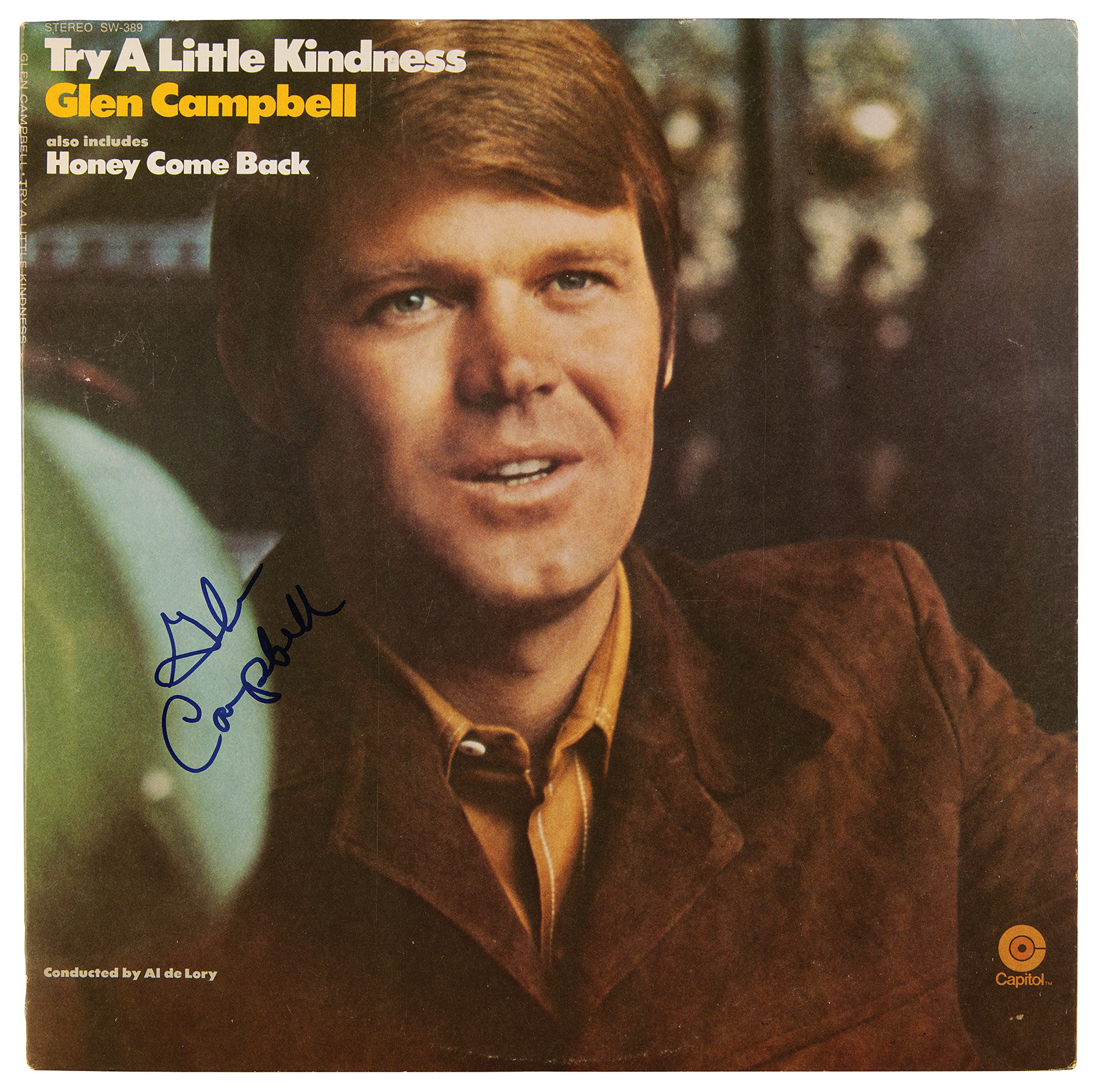 Try a Little Kindness album, signed on the front cover in blue felt tip by Glen Campbell. In fine condition, with a PSA/DNA affixed to the reverse. The record is included. Accompanied by a certificate of authenticity from PSA/DNA.