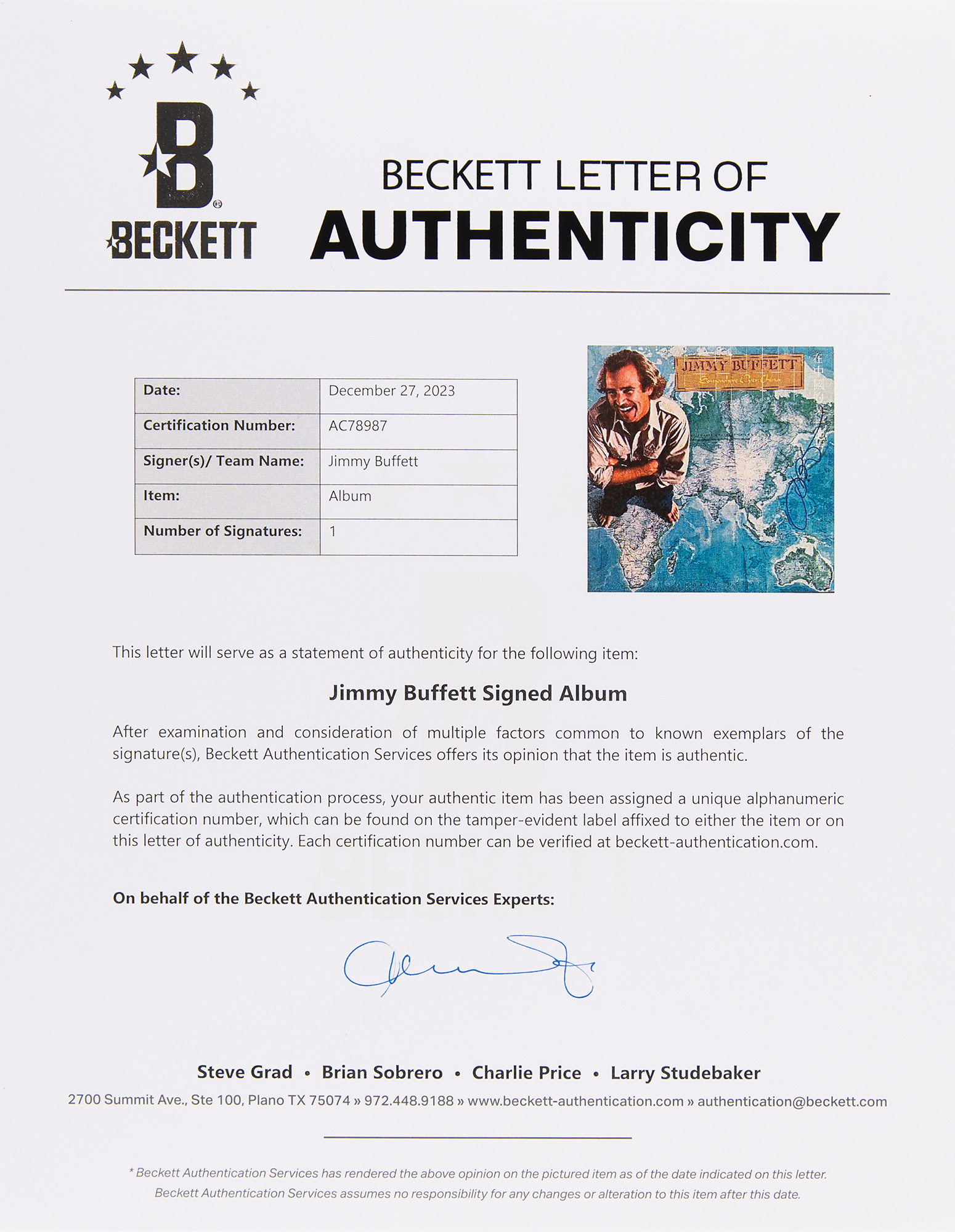 Somewhere Over China album signed on the front cover in blue felt tip by Jimmy Buffett. In fine condition, with a Beckett label affixed to the reverse. The record is included. Accompanied by a full letter of authenticity from Beckett Authentication Services.