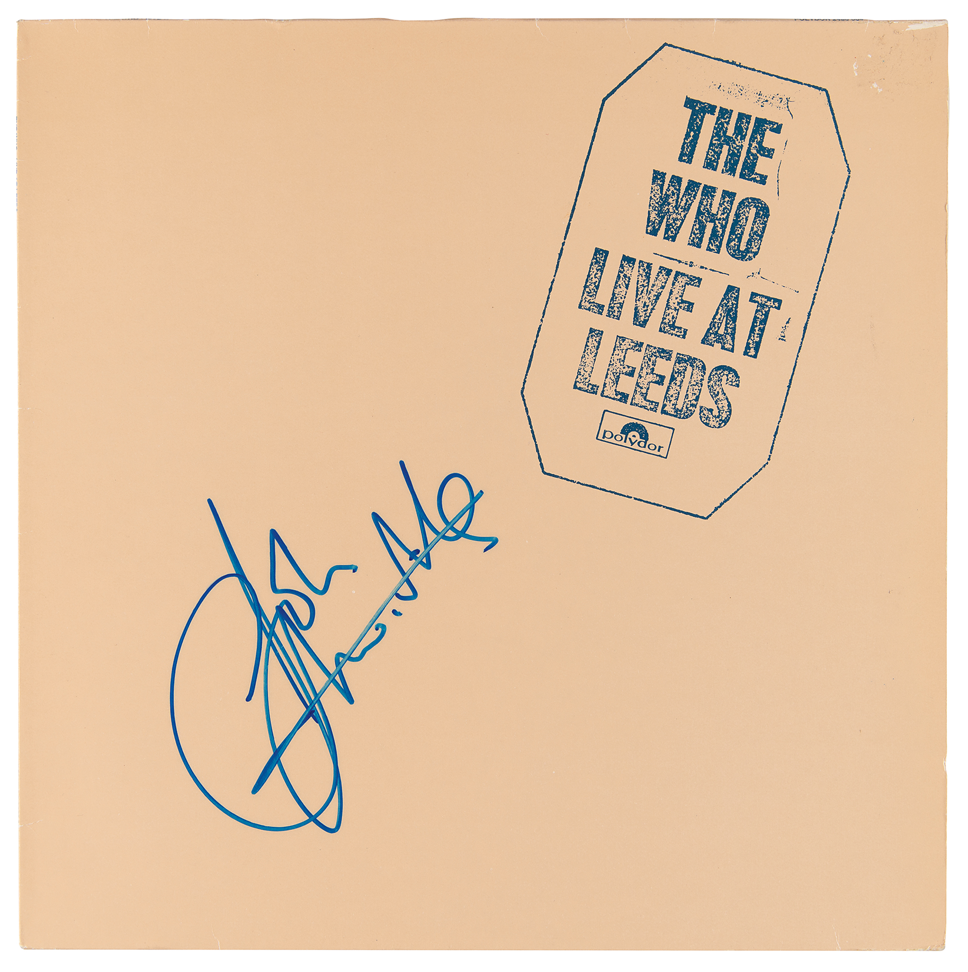 Live at Leeds album by The Who, signed on the front cover in blue felt tip by John Entwistle. In fine condition, with a Beckett label affixed to the reverse. The record is not included.