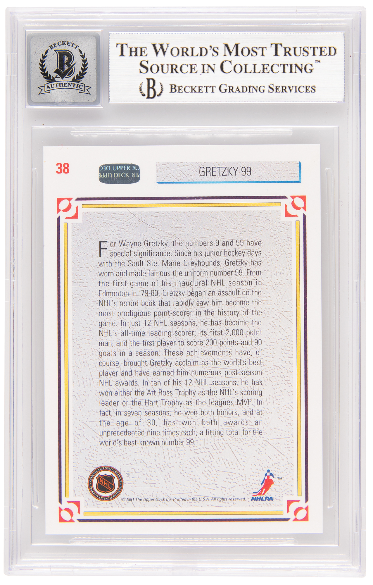 1991 Upper Deck #38 Wayne Gretzky hockey card, showing an artistic depiction of Gretzky wearing his Kings and Oilers uniforms next to two NHL trophies, signed in black felt tip, "Wayne Gretzky, 99." In very fine condition. Encapsulated in a Beckett authentication holder, which grades the autograph a '10.'