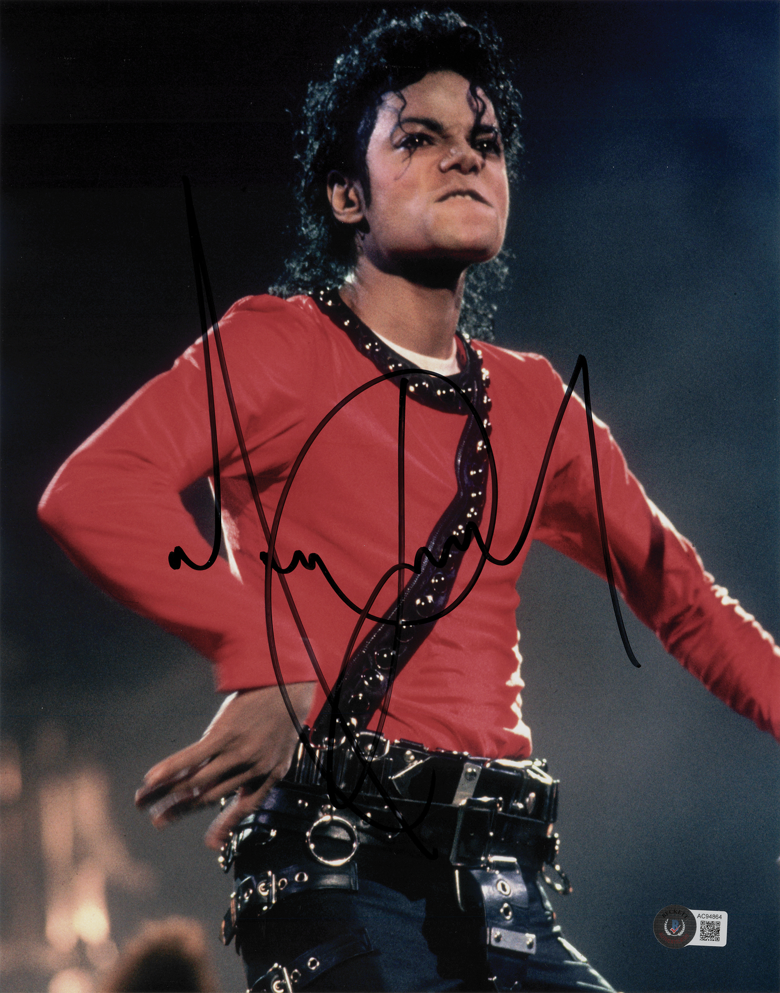 Color glossy 11 x 14 photo of Michael Jackson performing on stage, boldly signed in black felt tip. In very fine condition, with a Beckett label affixed to the lower right corner. Accompanied by a full letter of authenticity from Beckett Authentication Services.