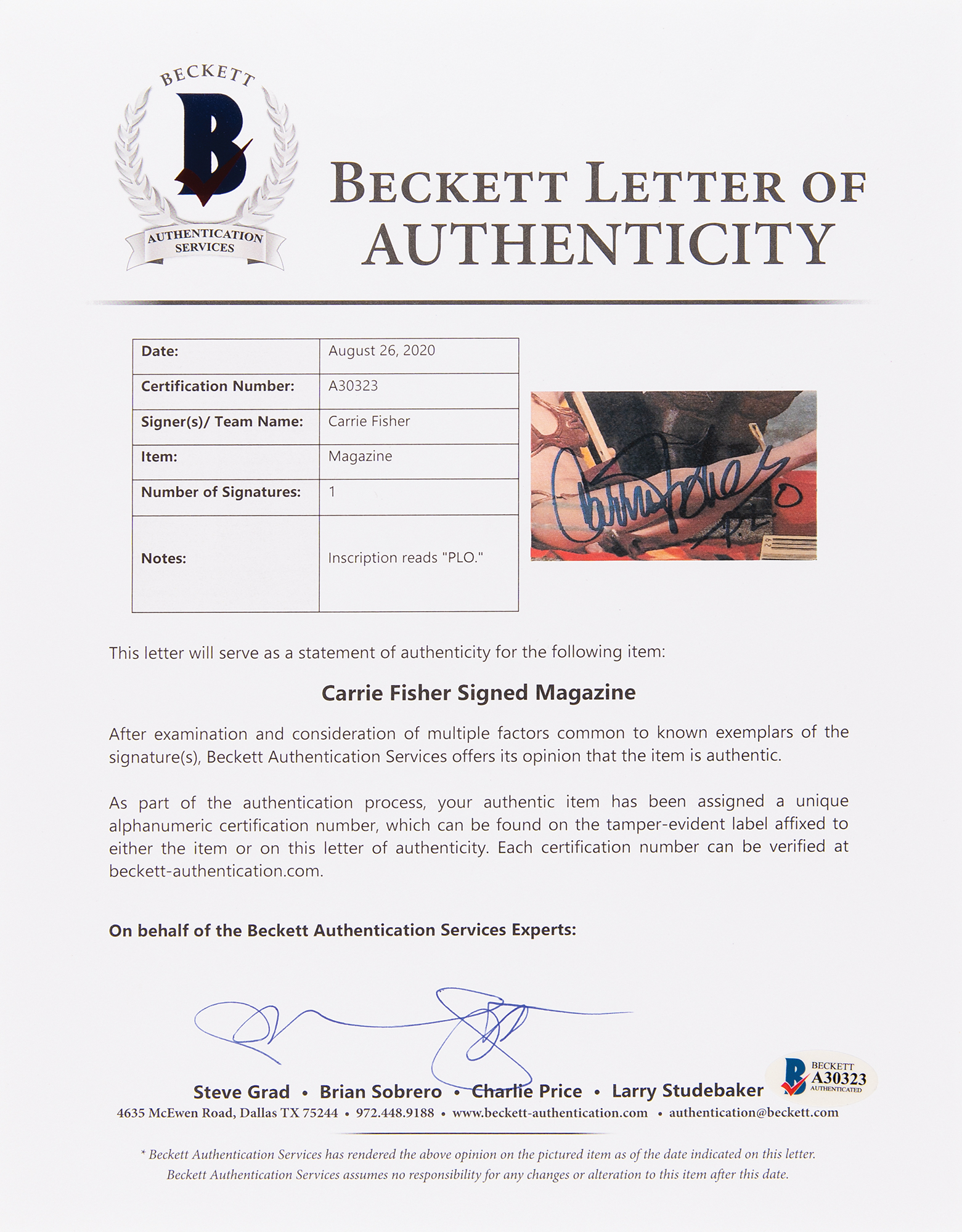 Complete issue of Rolling Stone magazine from July 21, 1983, 10.5 x 12.5, with the front cover featuring Carrie Fisher as Princess Leia in her iconic golden bikini having fun on a beach with fellow Star Wars characters including Darth Vader, an Ewok, and a Gamorrean, signed by Fisher in blue felt tip, "Carrie Fisher, P.L.O.," for 'Princess Leia Organa'—a scarce addition. In fine condition. Accompanied by a full letter of authenticity from Beckett Authentication Services.