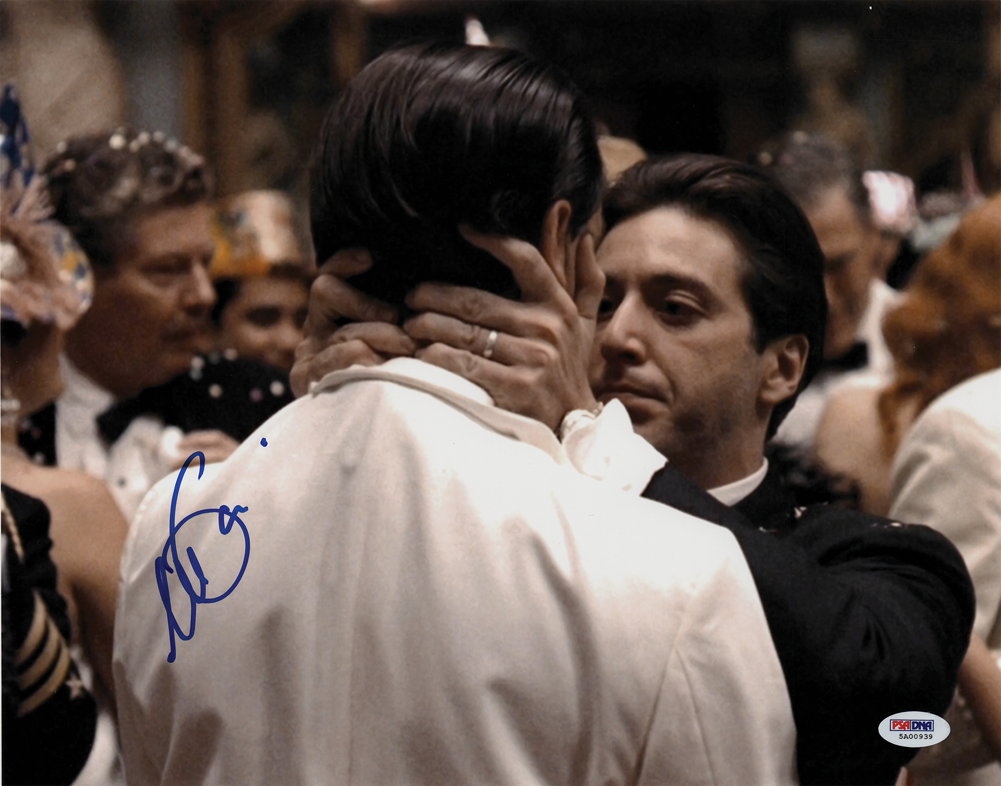 Color satin-finish 14 x 11 photo of Michael and Fredo Corleone in The Godfather Part II, signed in blue felt tip by Al Pacino. In very fine condition, with a PSA label affixed to the lower right corner. Accompanied by a certificate of authenticity from PSA/DNA (certifying it as an 'in the presence' signature on February, 20, 2013).