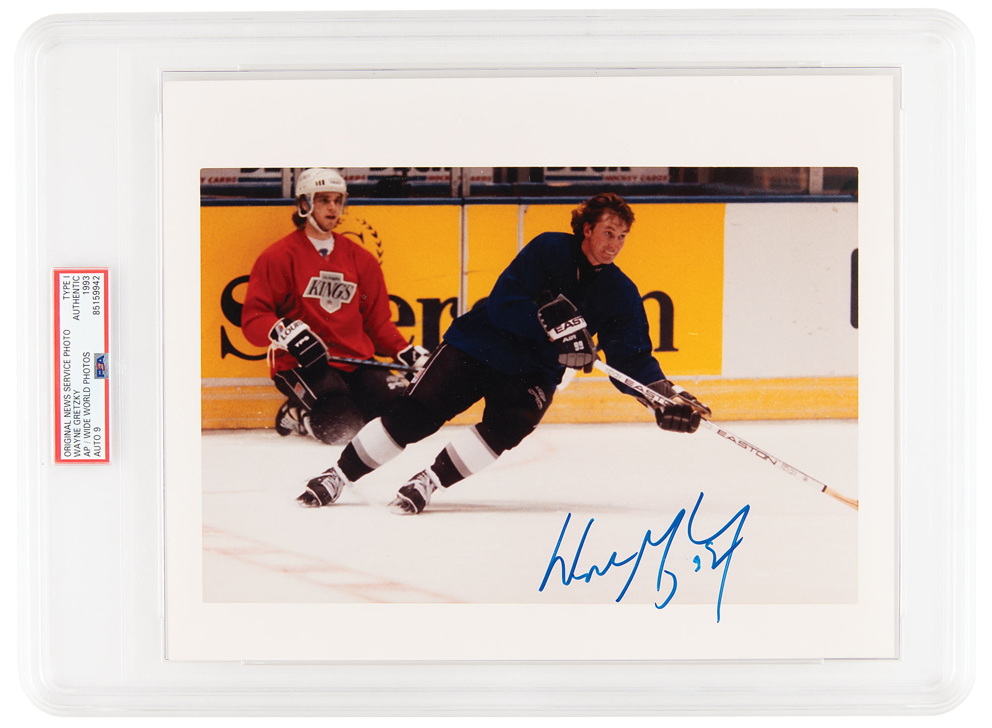 Original 1993 semi-glossy 10 x 8 AP/Wide World photo of Los Angeles Kings captain Wayne Gretzky skating hard during a practice drill, signed in blue felt tip "Wayne Gretzky, 99.” In very fine condition. Encapsulated by PSA as an authentic 'Type I' photograph, with an autograph grade of '9.' This photo was taken just one day before Gretzky would return to the ice for his 1,000th NHL game after a career-threatening back injury sidelined the captain.