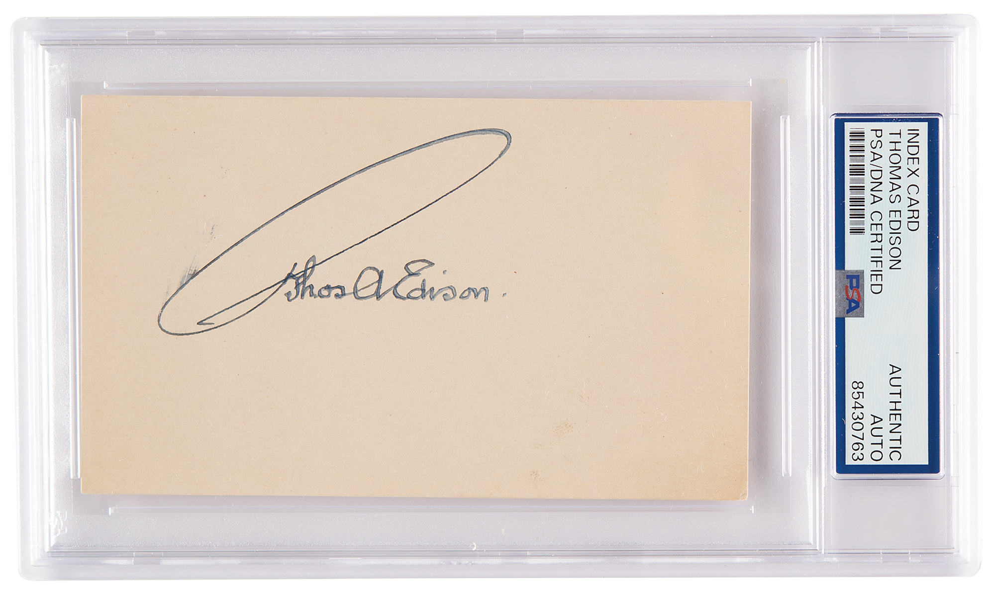 Classic ink 'umbrella' signature of Thomas Edison, "Thos. A. Edison,” on an off-white 5 x 3 card. In fine condition, with a trivial brush to the 'umbrella.' Encapsulated in a PSA/DNA authentication holder.