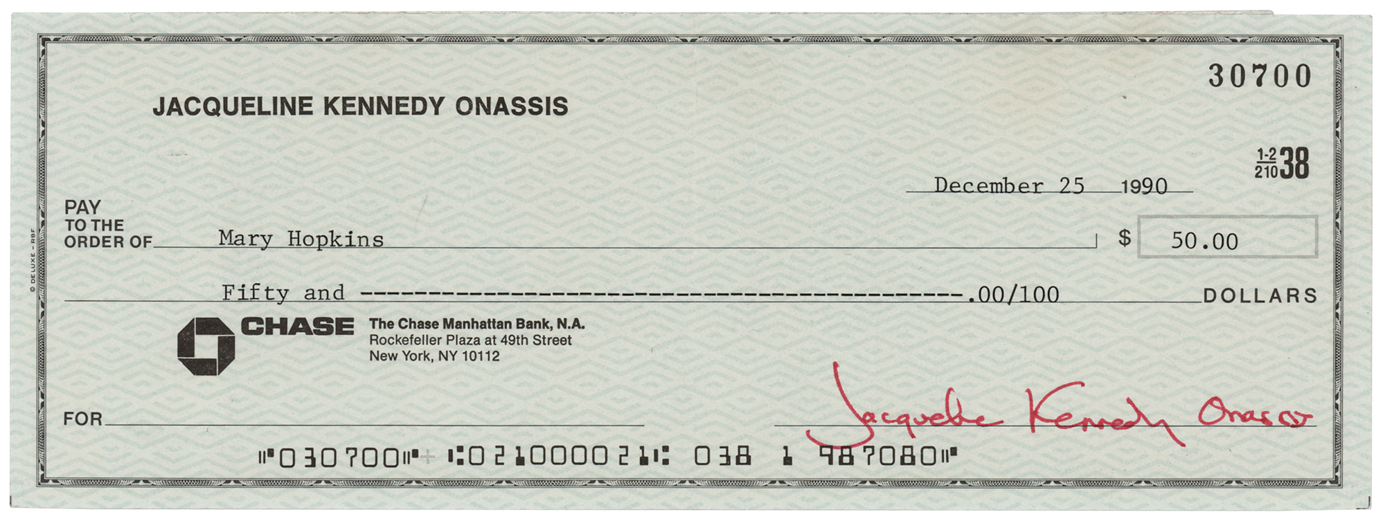 Uncashed personal check, 8.25 x 3, filled out in type and signed by Kennedy, "Jacqueline Kennedy Onassis," payable to Mary Hopkins for $50, December 25, 1990. In fine condition, with a central vertical fold and a mounting strip to the rear top edge.
