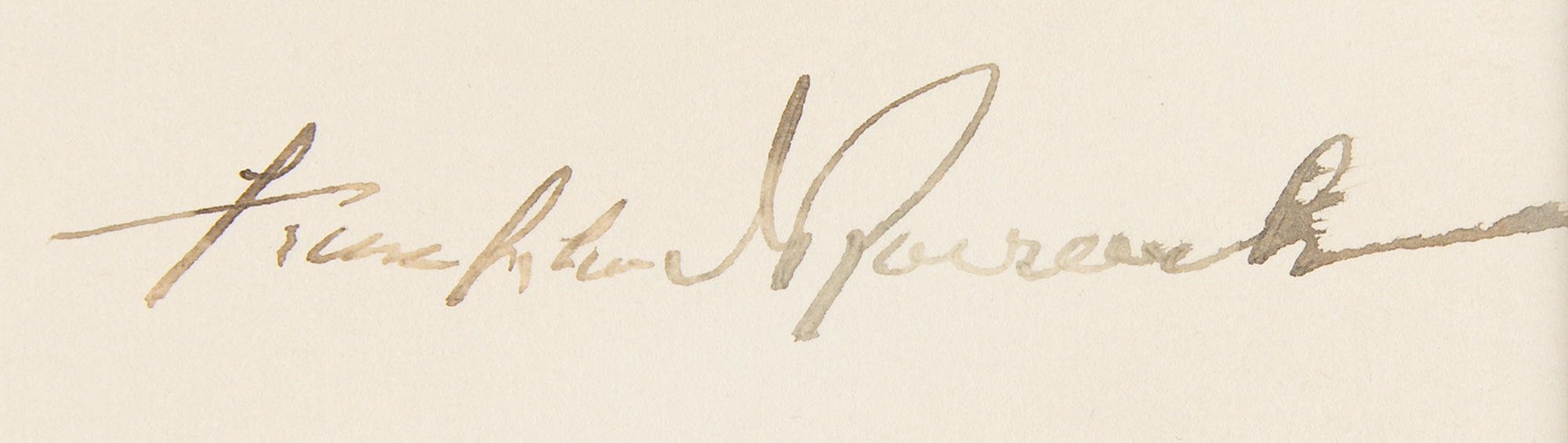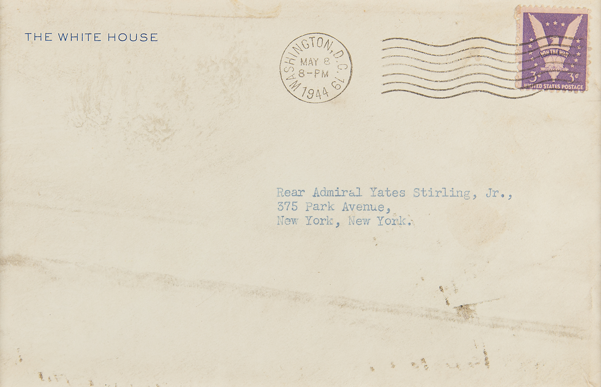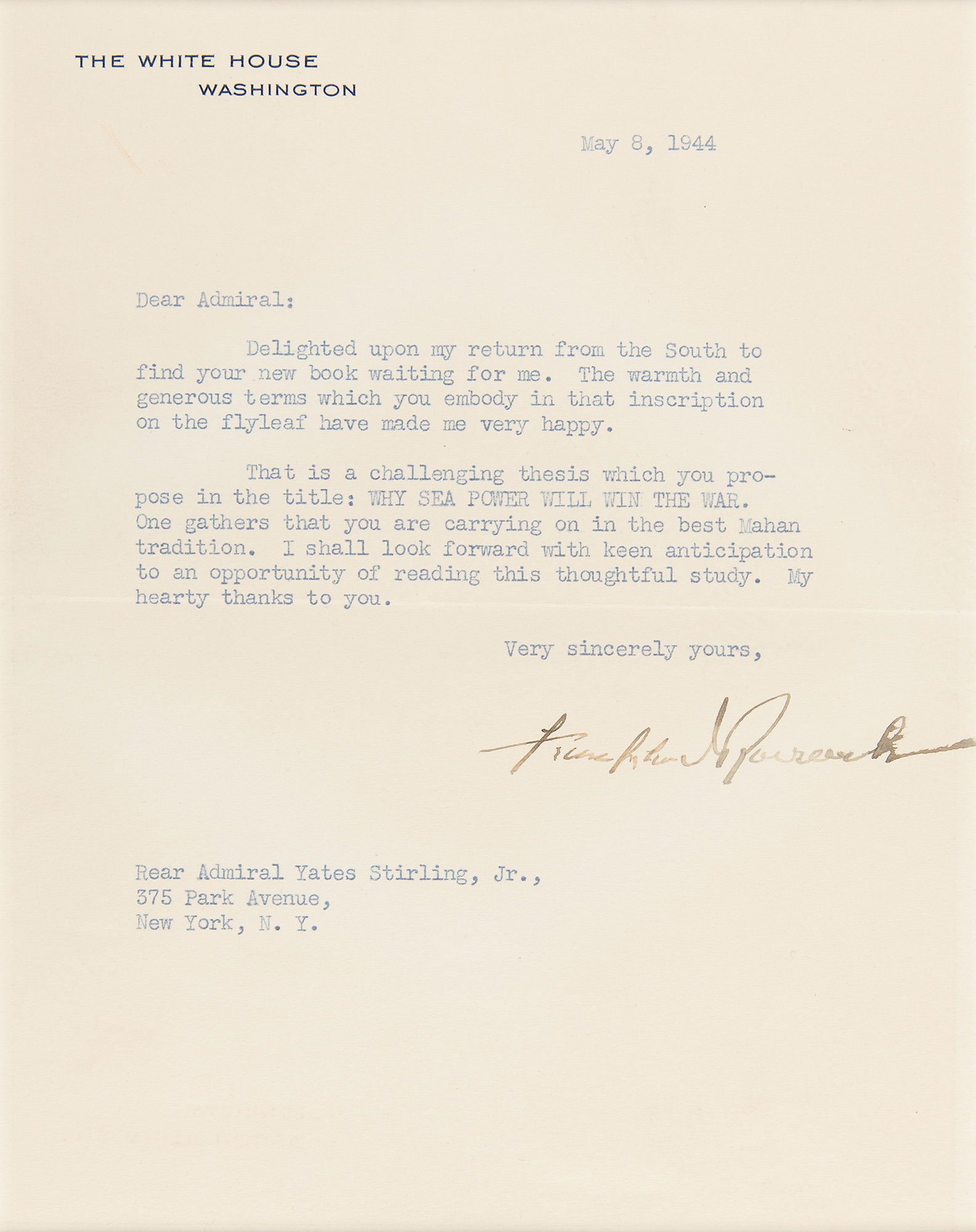 World War II–dated TLS as president, one page, 6.5 x 8.25, White House letterhead, May 8, 1944. Letter to Rear Admiral Yates Stirling, Jr., in full: "Delighted upon my return from the South to find your new book waiting for me. The warmth and generous terms which you embody in that inscription on the flyleaf have made me very happy. That is a challenging thesis which you propose in the title: Why Sea Power Will Win the War. One gathers that you are carrying on in the best Mahan tradition. I shall look forward with keen anticipation to an opportunity of reading this thoughtful study. My hearty thanks to you." Archivally double-matted and framed under museum glass with the original White House mailing envelope, and a portrait, plaque, and dollar coin to an overall size of 24.5 x 23. In fine condition, with the coin loose within the mat.