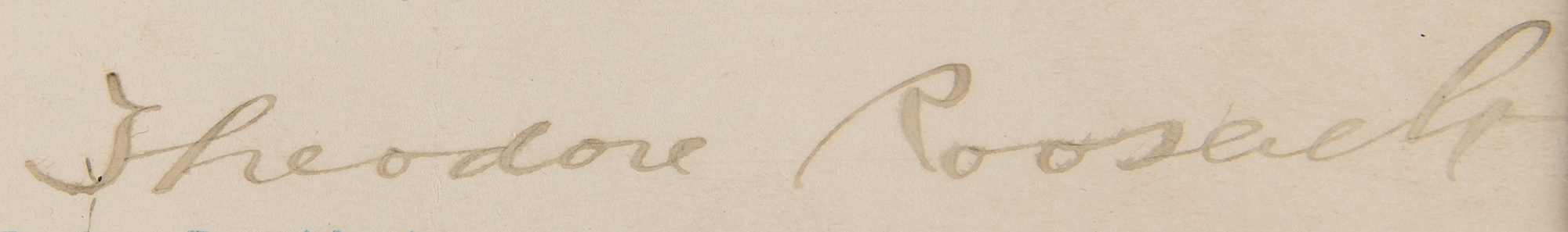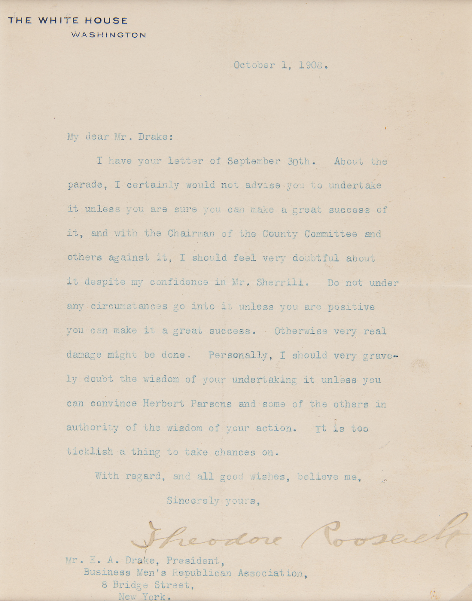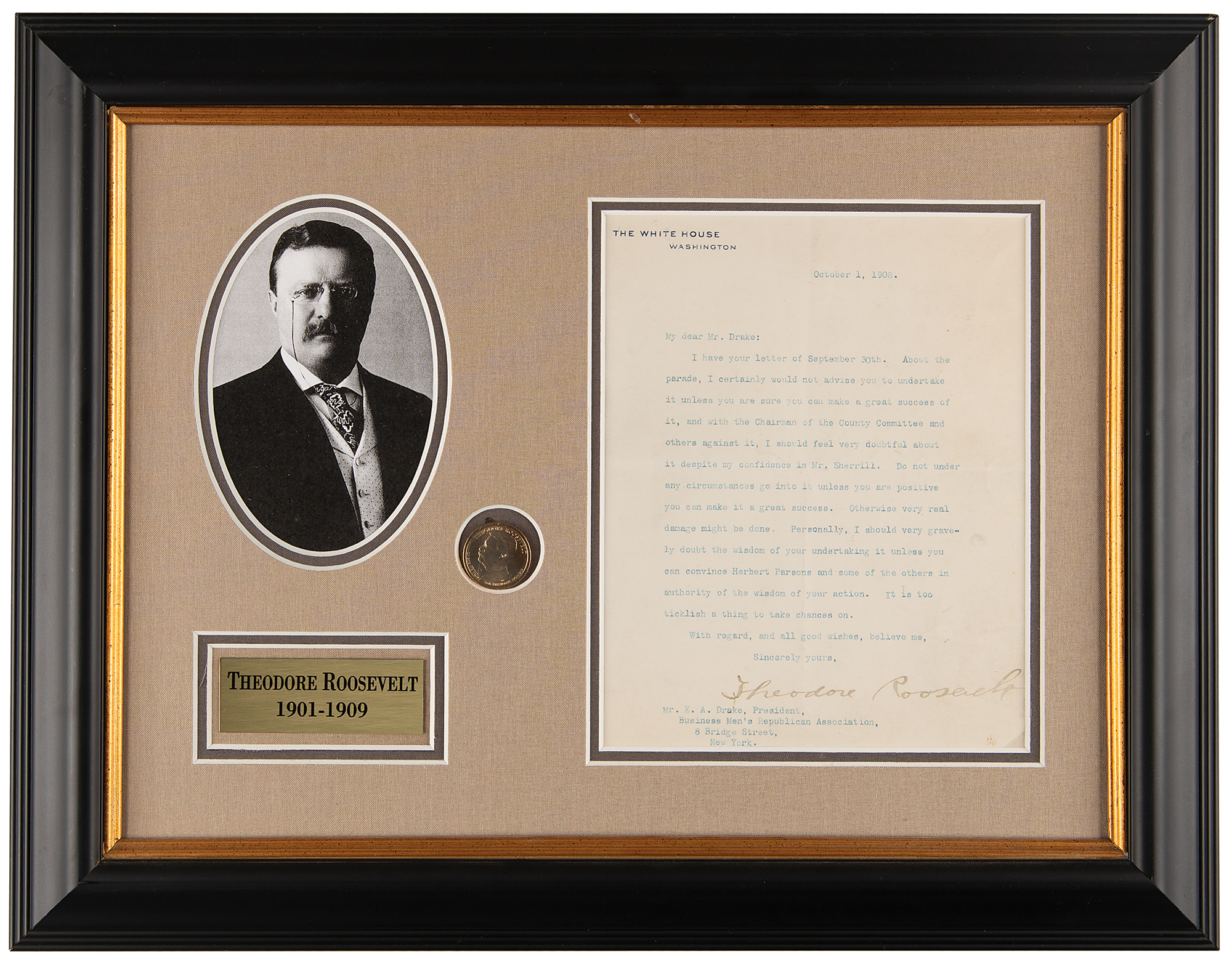 TLS as president, one page, 6.5 x 8.25, White House letterhead, October 1, 1908. Letter to E. A. Drake, president of the "Business Men's Republican Association," in part: "About the parade, I certainly would not advise you to undertake it unless you are sure you can make a great success of it, and with the Chairman of the County Committee and others against it. I should feel very doubtful about it despite my confidence in Mr. Sherrill. Do not under any circumstances go into it unless you are positive you can make it a great success. Otherwise very real damage might be done. Personally, I should very gravely doubt the wisdom of your undertaking it unless you can convince Herbert Parsons and some of the others in authority of the wisdom of your action. It is too ticklish a thing to take chances on." Archivally double-matted and framed under museum glass with a portrait, plaque, and dollar coin to an overall size of 18.5 x 14.5. In fine condition, with the coin loose within the mat.