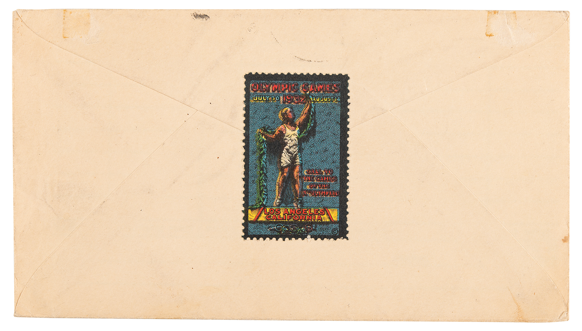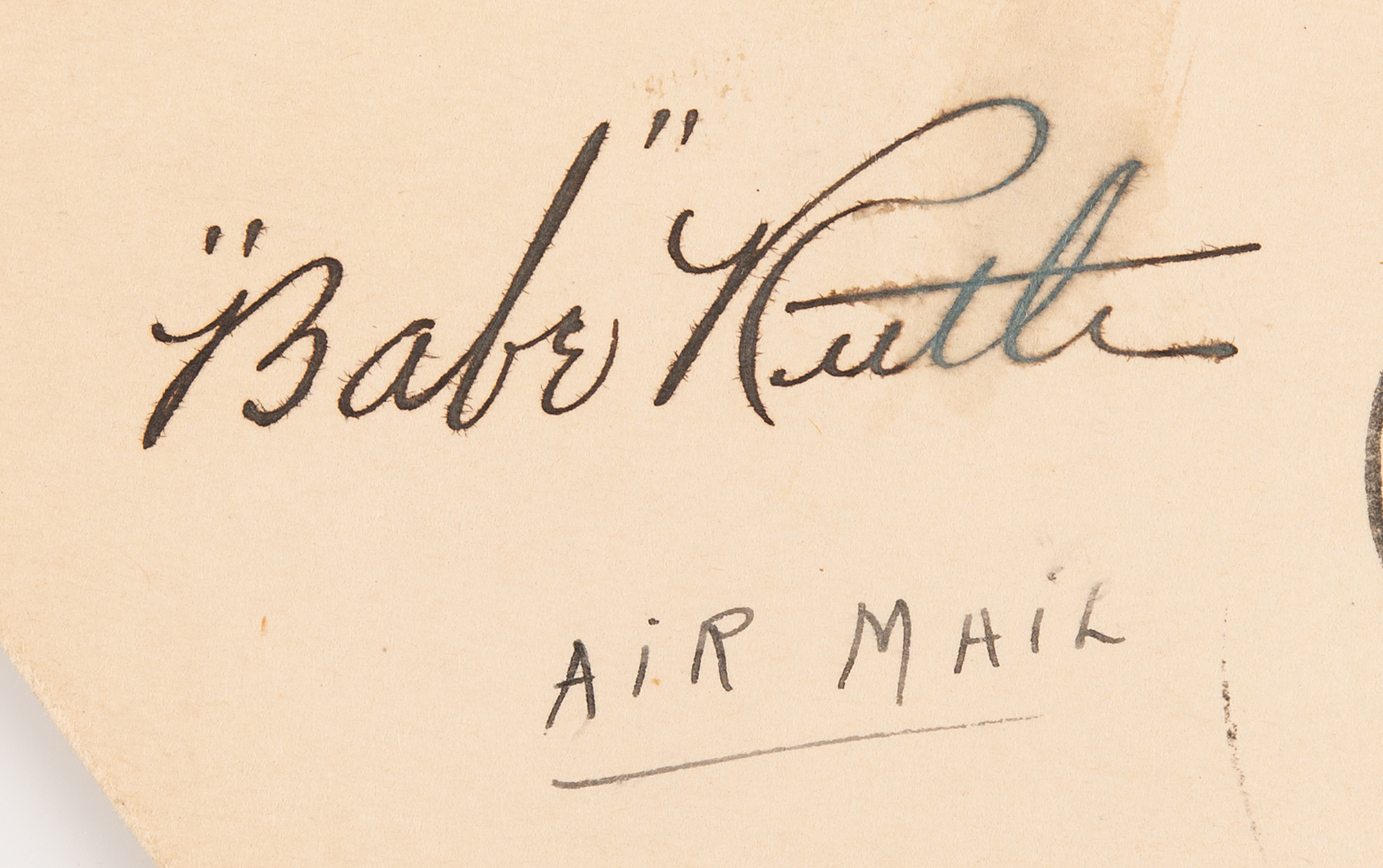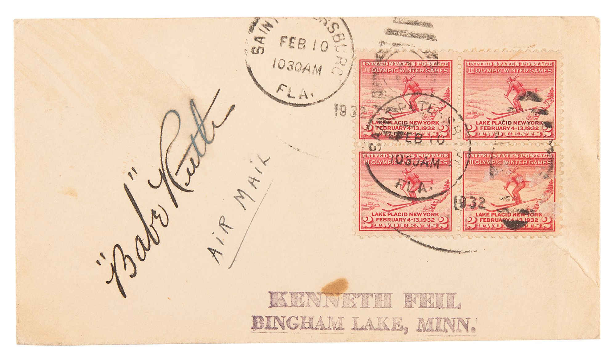 Vintage fountain pen signature, "'Babe' Ruth,” on an off-white 5.5 x 3 airmail cover, postmarked at Saint Petersburg, Florida, on February 10, 1932. The cover bears four two-cent postage stamps commemorating skiing at the Lake Placid 1932 Winter Olympics, and the reverse bears a stamp honoring the Los Angeles 1932 Summer Olympics. In fine condition, with a faint stain touching Ruth's last name.
