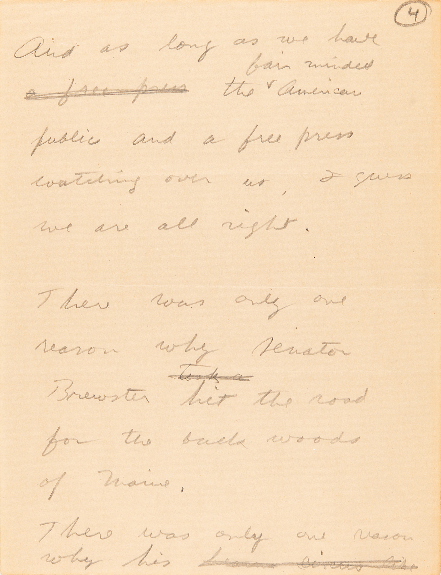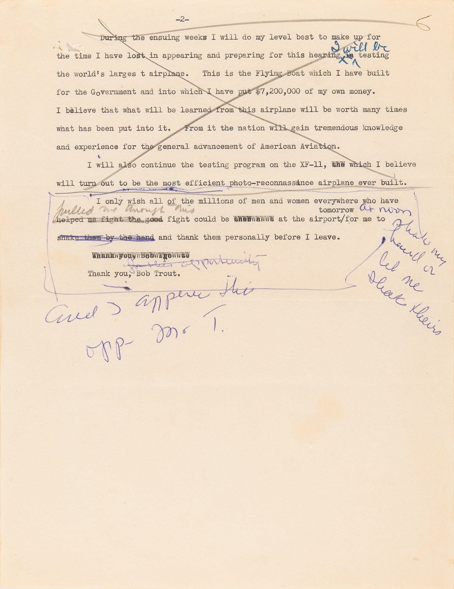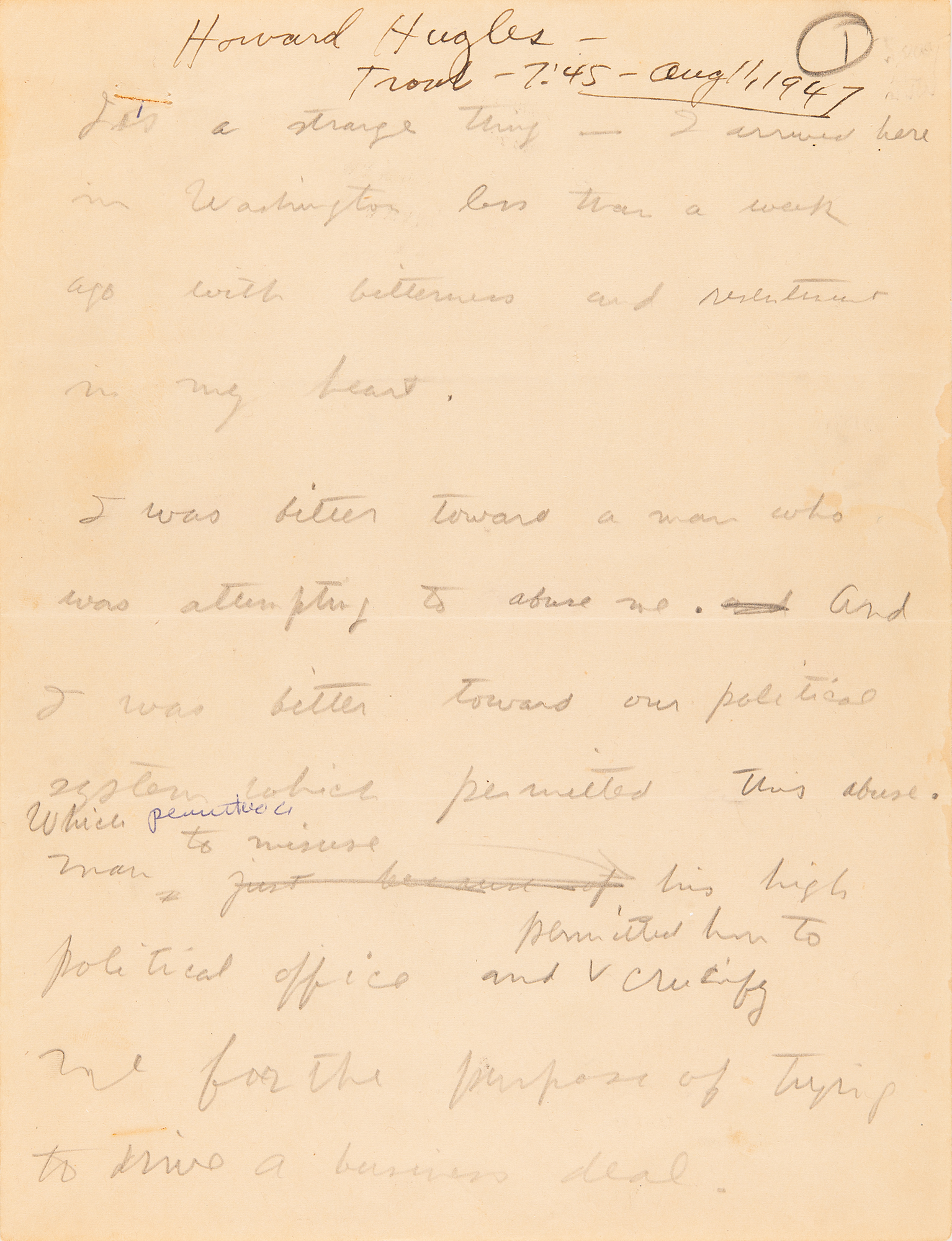 Unsigned handwritten manuscript in pencil by Howard Hughes, five pages, 8.5 x 11, headed at the top in another hand: "Howard Hughes—Trout—7:45—Aug. 11, 1947." Hughes writes out some notes for his interview on Robert Trout's radio show, regarding the defense of his 'Spruce Goose' airplane project before a Congressional committee. Hughes writes, in part (additions and strike-throughs represented in brackets): "It's a strange thing—I arrived here in Washington less than a week ago with bitterness and resentment in my heart. I was bitter toward a man who was attempting to abuse me. And I was bitter toward our political system which permitted this abuse. Which [permitted a] man to misuse his high political office and permitted him to crucify me for the purpose of trying to drive a business deal. Yes: I was bitter toward our whole system of politics [and its imperfections]. But I have learned a great deal during my brief stay in Washington.