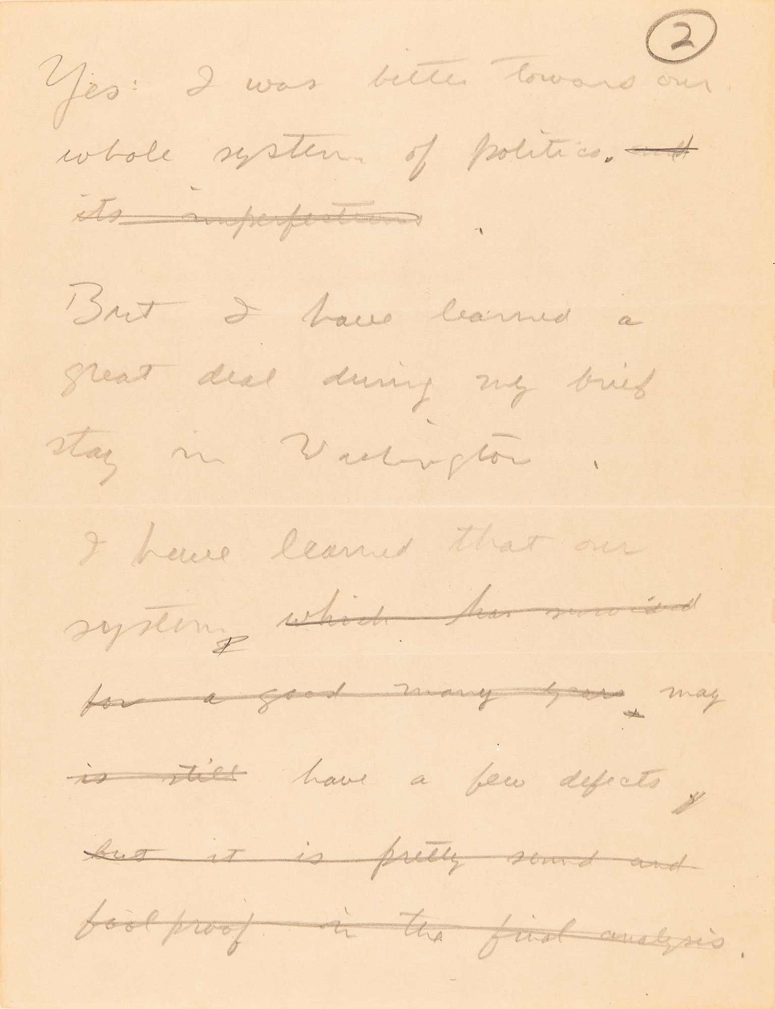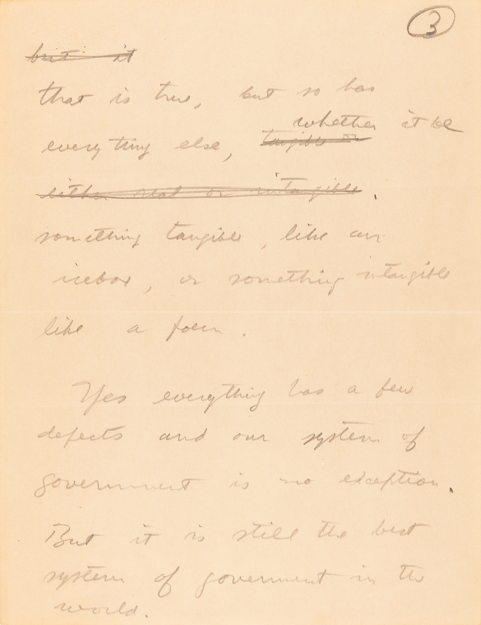 I have learned that our system [which has survived for a good many years] may [is still] have a few defects [but it is pretty sound and foolproof in the first analysis but it] that is true, but so has everything else, whether it be something tangible, like an icebox, or something intangible like a poem.