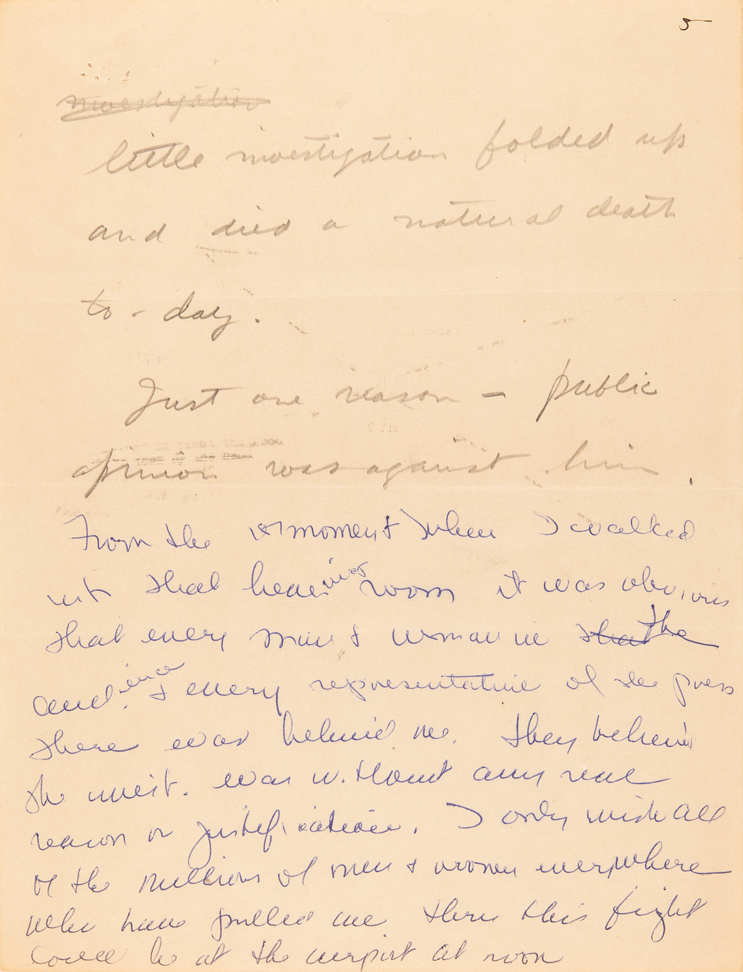 The statement is continued in another hand in blue ballpoint and type: "From the moment when I walked into that hearing room it was obvious that every man & woman in the audience & every representative of the press there was behind me…I only wish all of the millions of men & woman everywhere who have pulled me thru this fight could be at the airport at noon.