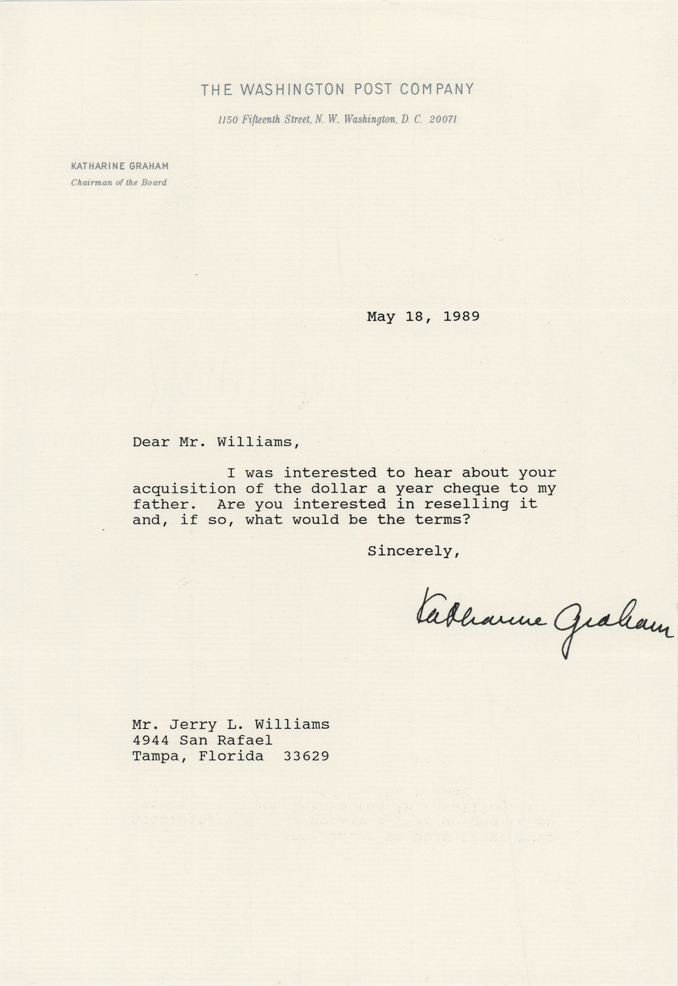 Accompanied by a 1989 letter from his daughter, Katharine Graham, who led the The Washington Post from 1963 to 1991, inquiring about the availability of the check.