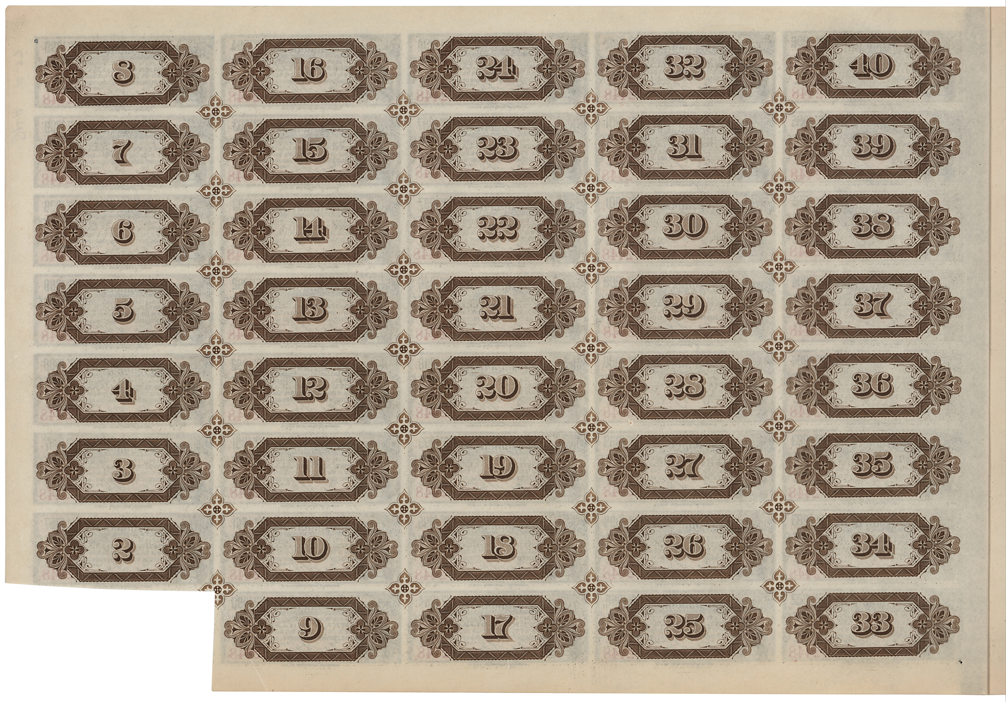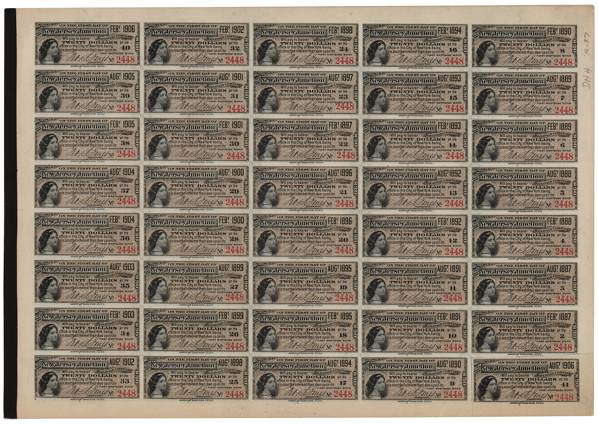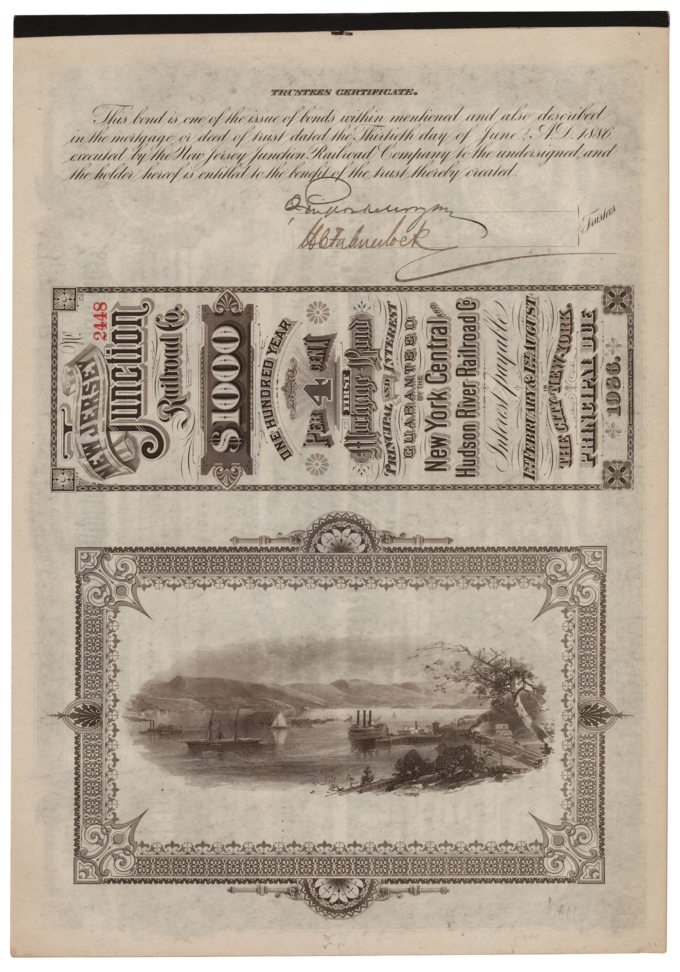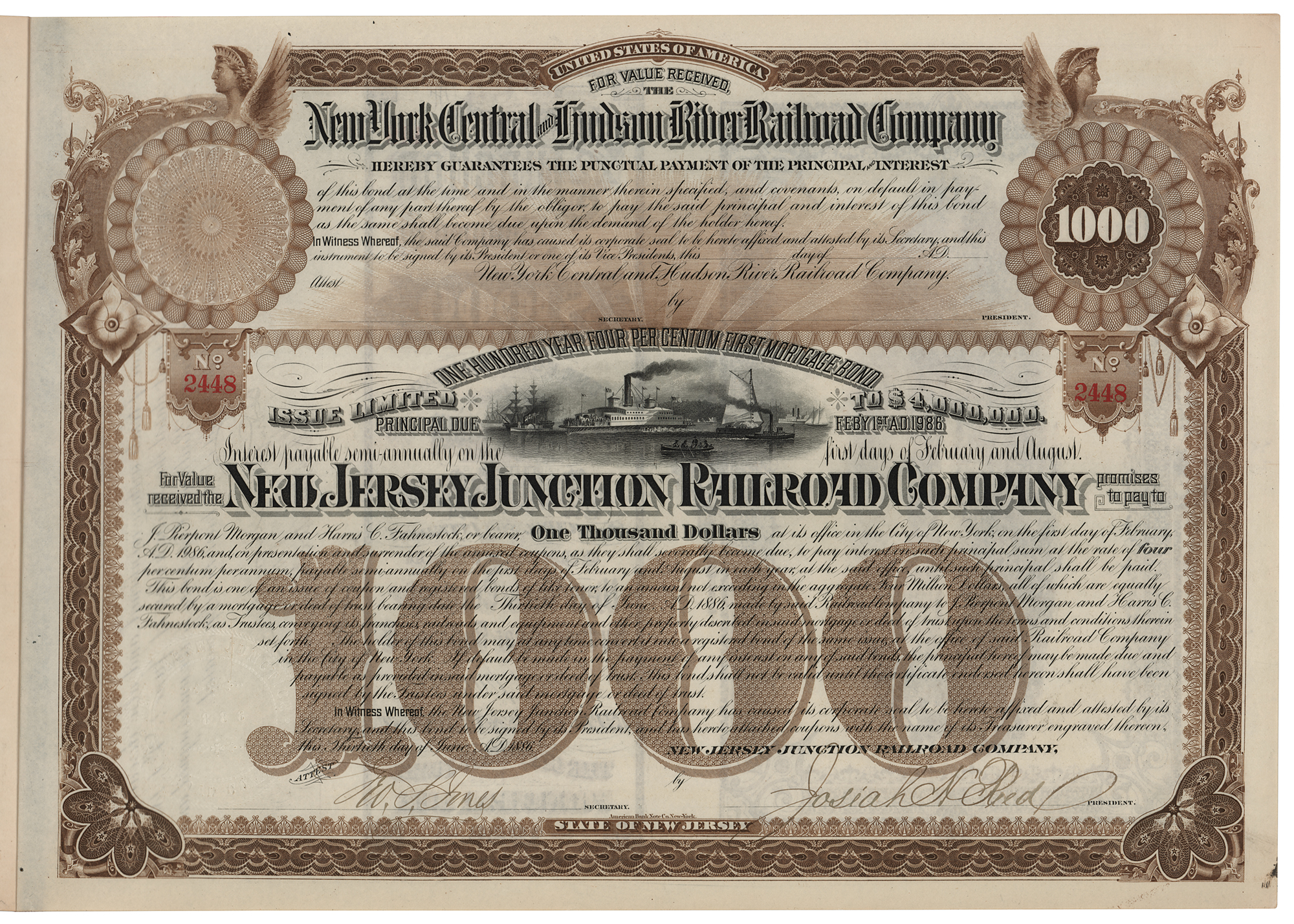 Partly-printed DS, signed “J. Pierpont Morgan,” one page, 13.5 x 9.5, June 30, 1886. First mortgage bond of the New Jersey Junction Railroad Company in the amount of $1000, endorsed on the reverse by J. P. Morgan and H. C. Fahnestock as trustees. Unaccomplished and bound at the left edge with five pages of the original coupons, with 199 of 200 still present. In fine condition.
