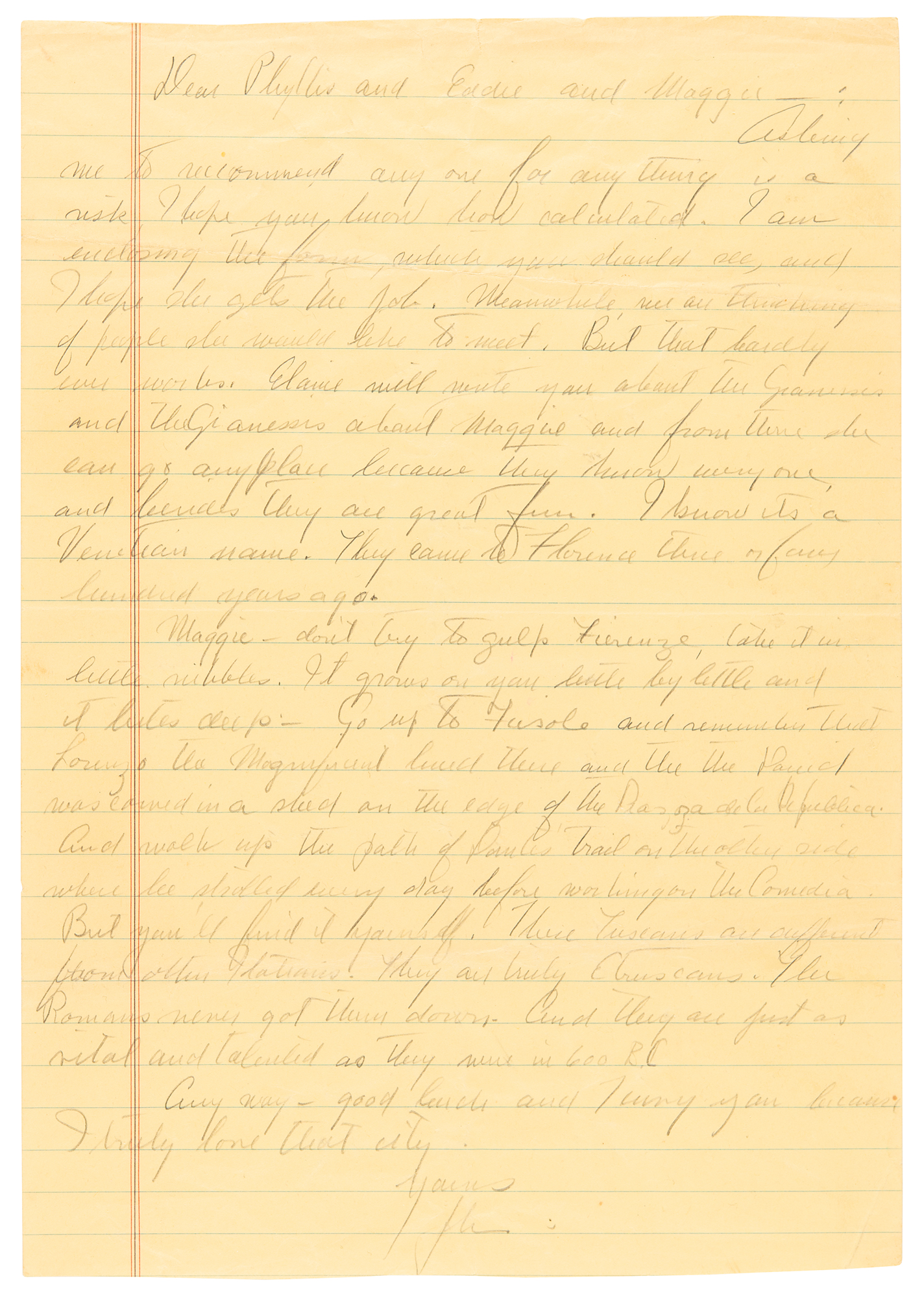 Maggie—don't try to gulp Firenze, take it in little nibbles. It grows on you little by little…Go up to Fiesole and remember that Lorenzo the Magnificent lived there and…the David was carved…on the edge of the Piazza della Republica. And walk up the path of Dante's Trail on the other side where he strolled every day before working on the Comedia." On the next page, he adds a handwritten postscript, signed "J.S.," in part: "I am returning the clippings which you may want to keep but I am keeping two of the photographs. Maggie will do just fine in Florence." In very good to fine condition, with overall creasing, and a few small tears to the top edge.