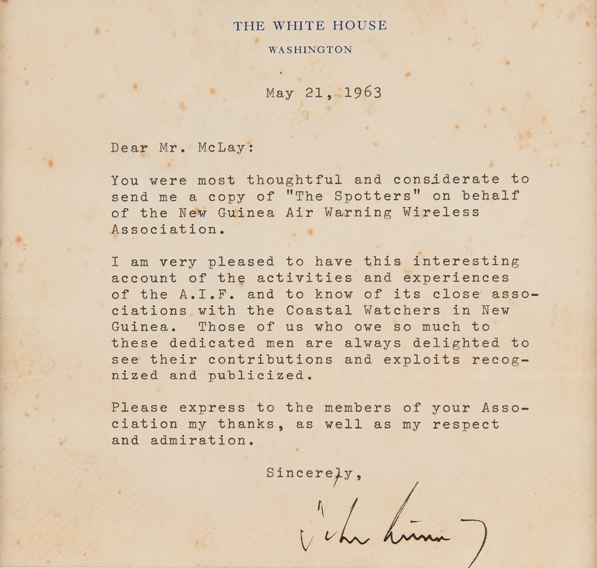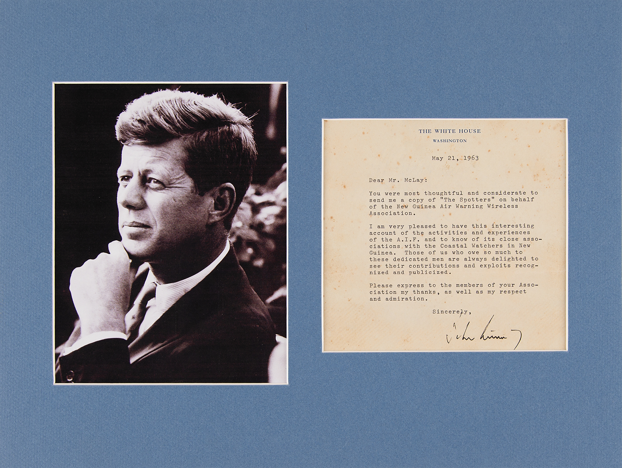 TLS as president signed “John Kennedy,” one page, 6.25 x 5.75, White House letterhead, May 21, 1963. Letter to Mr. McLay, in full: “You were most thoughtful and considerate to send me a copy of ‘The Spotters’ on behalf of the New Guinea Air Warning Wireless Association. I am very pleased to have this interesting account of the activities and experiences of the A.I.F. and to know of its close associations with the Coastal Watchers in New Guinea. Those of us who owe so much to these dedicated men are always delighted to see their contributions and exploits recognized and publicized. Please express to the members of your Association my thanks, as well as my respect and admiration.” Matted with a photo of Kennedy to an overall size of 15.75 x 12. In very good to fine condition, with scattered light foxing.