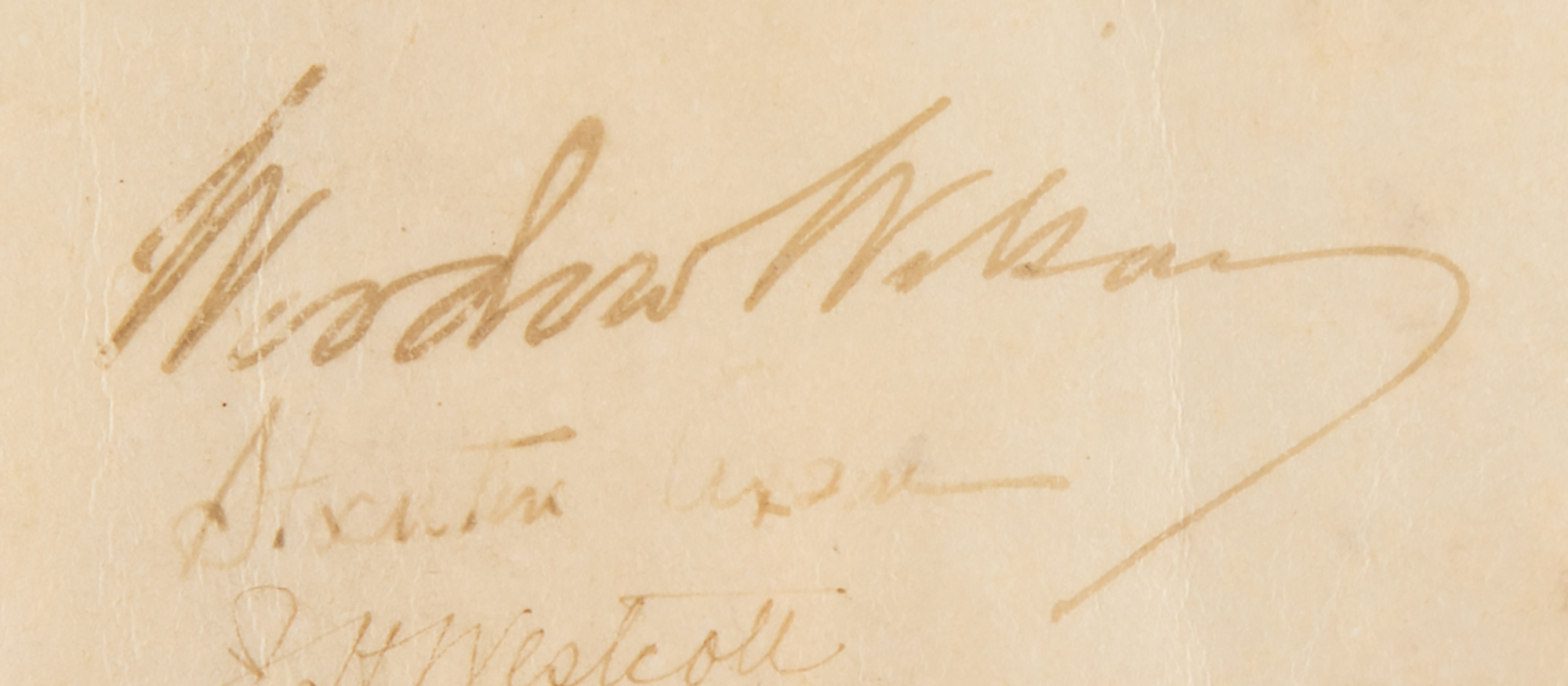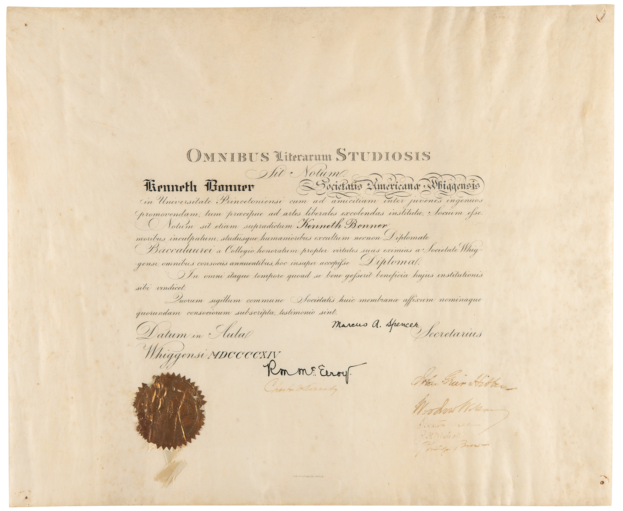 Partly-printed vellum DS in Latin, one page, 16.5 x 13.75, no date. Diploma issued to Kenneth Bonner for the University of Princeton's "Societas Americana Whiggensis," signed at the conclusion in fountain pen by seven Princeton figures including Woodrow Wilson and John Grier Hibben, his successor as the university's president. The gold foil seal and ribbon affixed at lower left remain partially intact. In very good to fine condition, with tack holes to the corners, and light damage to the gold seal.