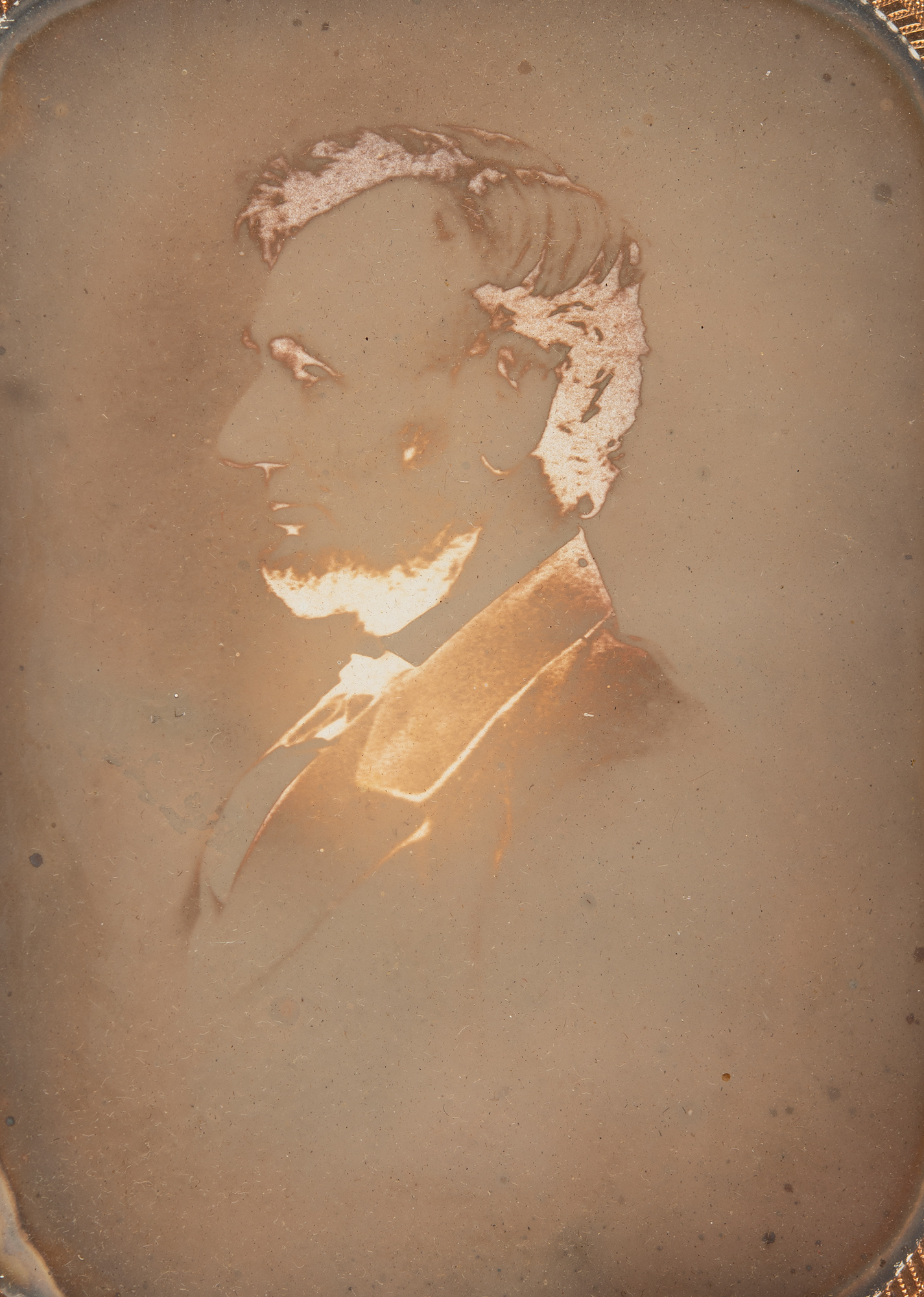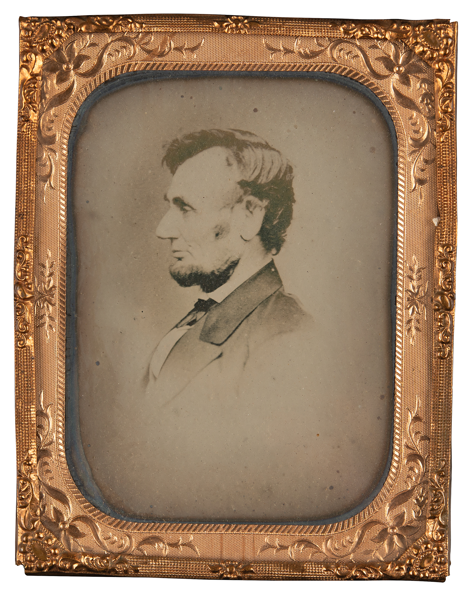 Ambrotype photograph of Abraham Lincoln, 3.25 x 4.25, featuring a mirror-image rendering of Anthony Berger's 'Penny Profile' portrait taken at Brady's studio on February 9, 1864. In very good condition.