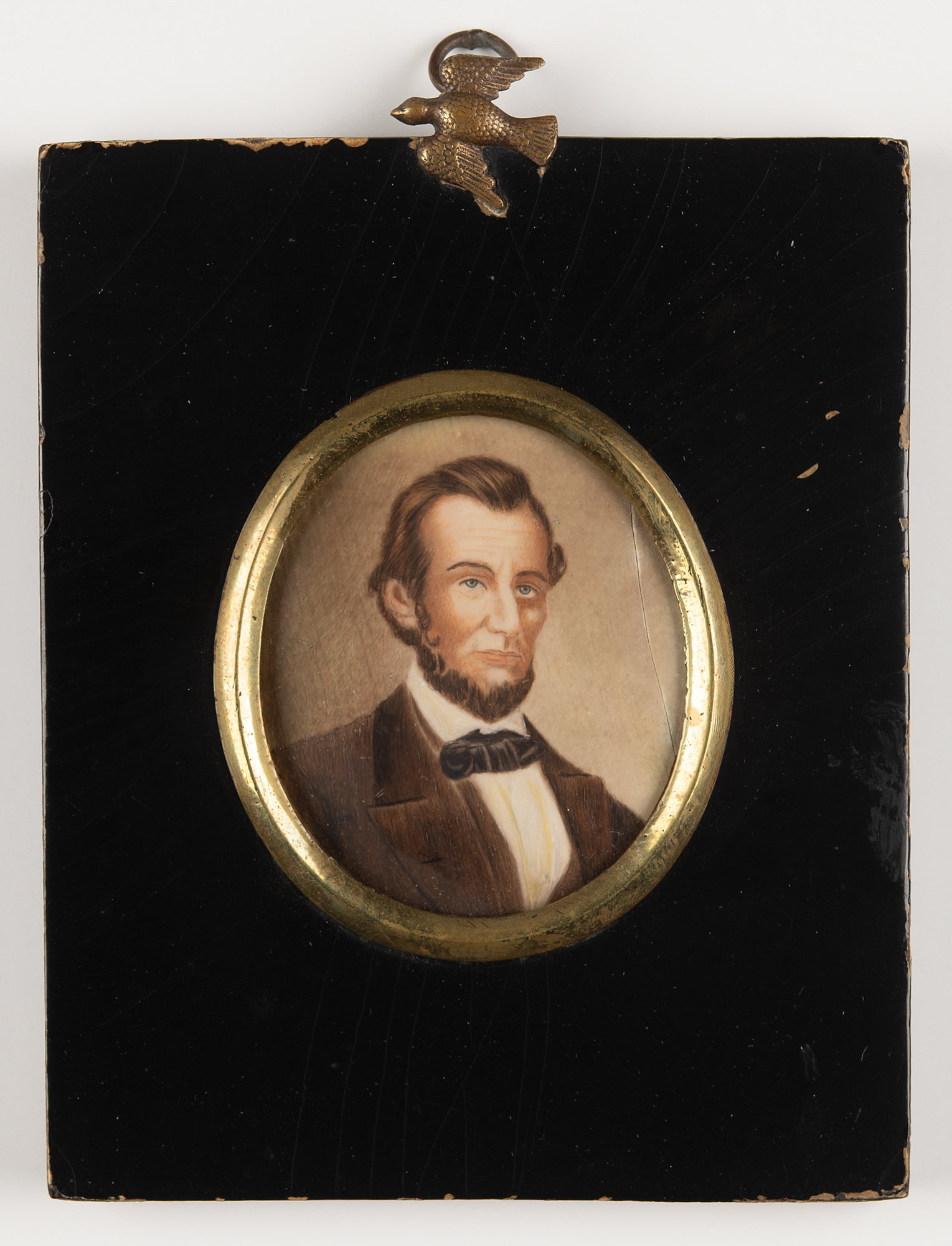 Interesting 2 x 2.5 miniature portrait of Abraham Lincoln in a bust-length pose, executed in watercolor on ivory by a talented unknown artist after a portrait held by a museum in Indiana (according to an accompanying note). Framed to an overall size of 4.25 x 5.25. In very good condition, with a crack to the right edge of the ivory material.