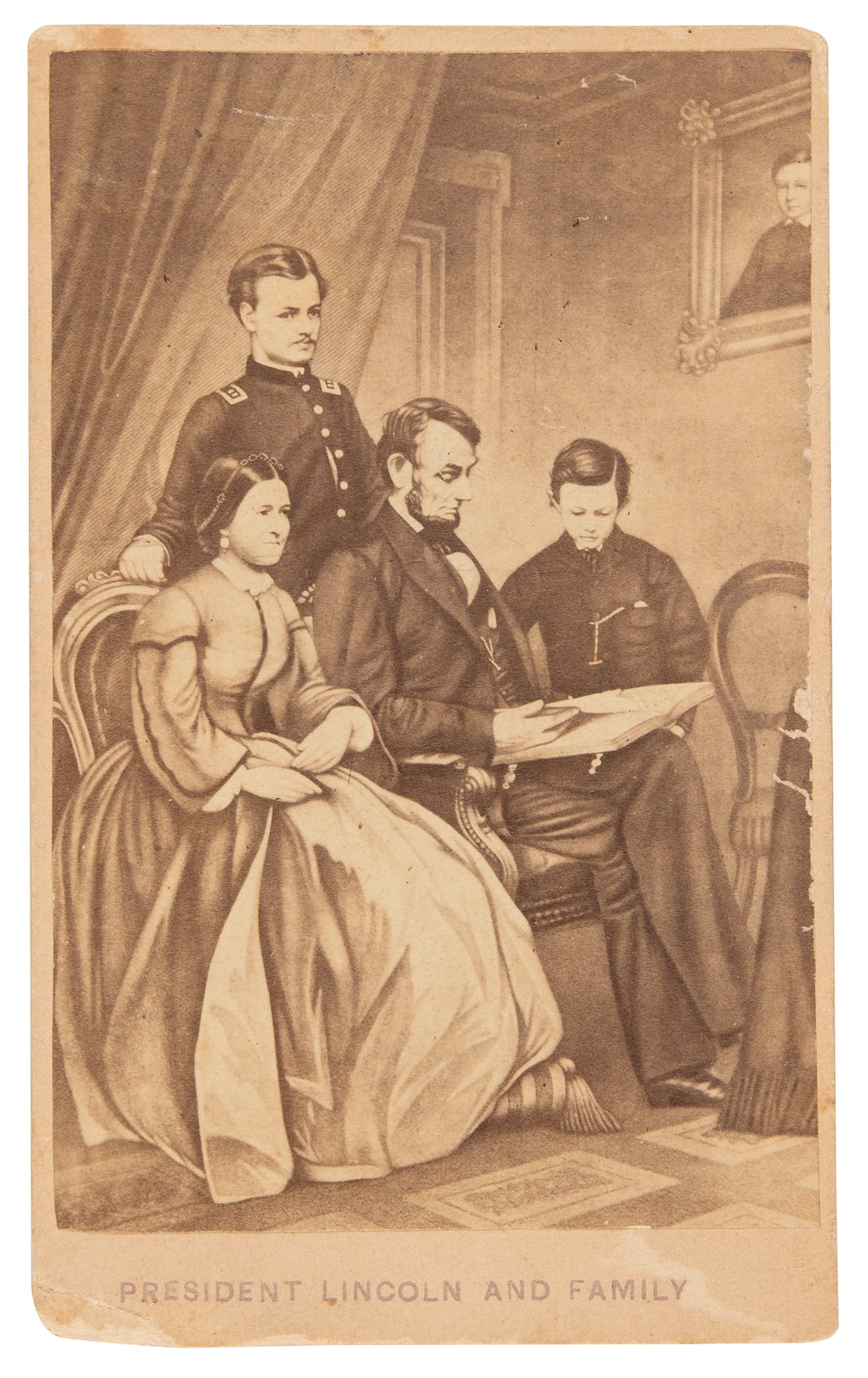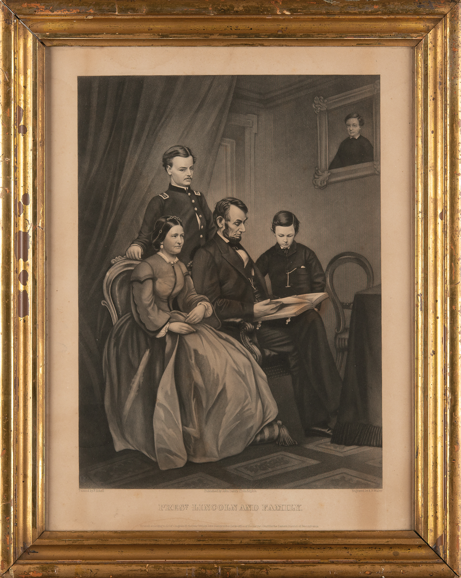 Outstanding 12 x 15.5 engraving of President Lincoln and his family by Adam B. Walter after a painting by Frederic B. Schell, published by John Dainty of Philadelphia, imprinted in the lower border with an 1865 copyright notice. The classic image, based largely on a photograph taken by Mathew Brady, shows President Abraham Lincoln paging through a large album with his son, Tad, looking on; Mary Todd Lincoln is seated beside them, and Robert Todd Lincoln, dressed in military uniform stands behind; a portrait of their late son, Willie, adorns the wall. Framed to an overall size of 15 x 18.5. In fine condition, with chipping to the frame. Accompanied by a carte-de-visite featuring an image of Schell's painting.