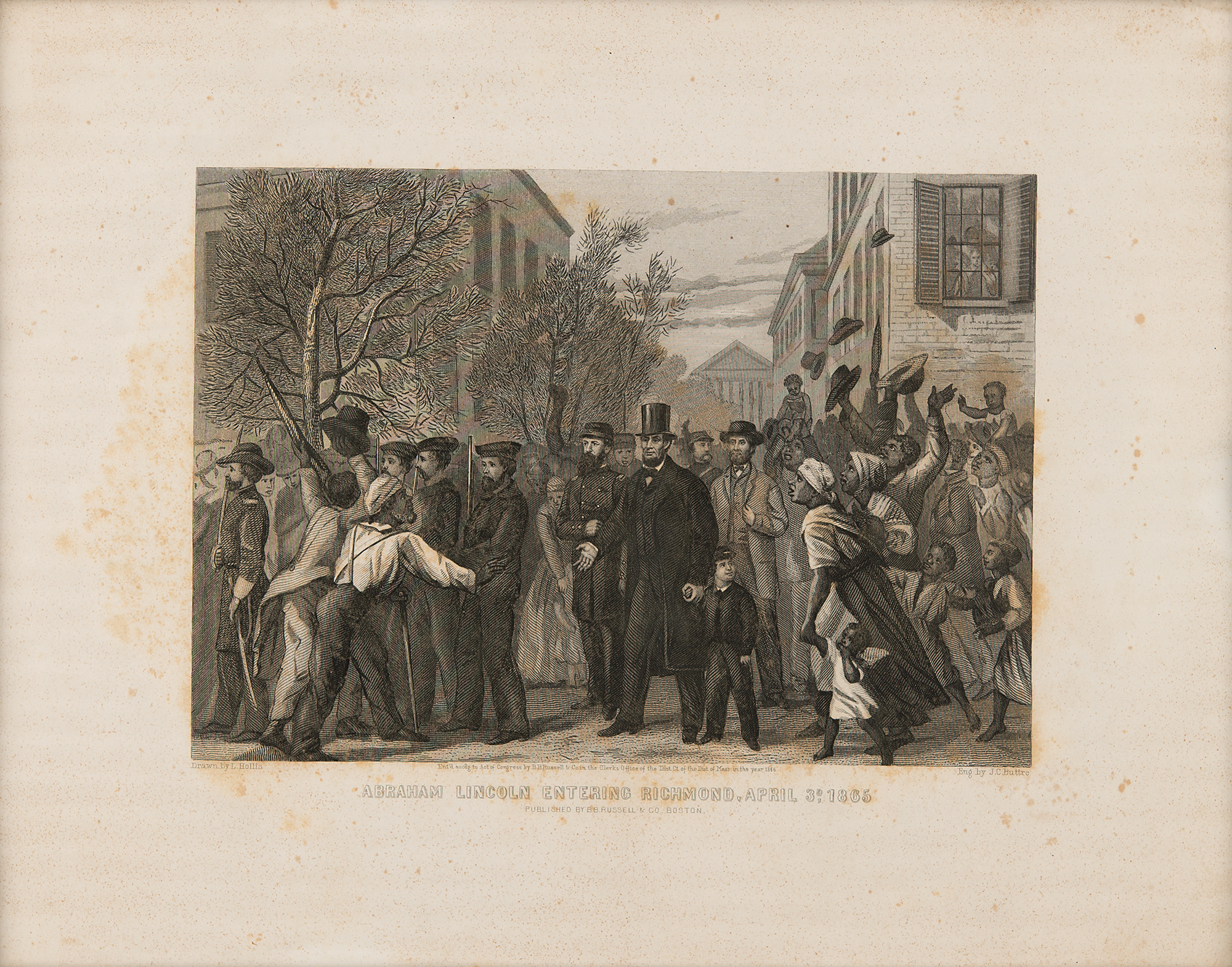 Sharp 10 x 7.75 engraving entitled "Abraham Lincoln Entering Richmond, April 3d 1865," engraved by J. C. Buttre from a drawing by L. Hollis, and published by B. B. Russell & Co. of Boston, imprinted in the lower border with an 1866 copyright notice. The dramatic scene shows President Lincoln with his son, Tad, on a visit to Richmond, with African American men, women, and children rejoicing around them. Displayed in a contemporary frame to an overall size of 14 x 11.75. In fine condition, with scattered foxing.