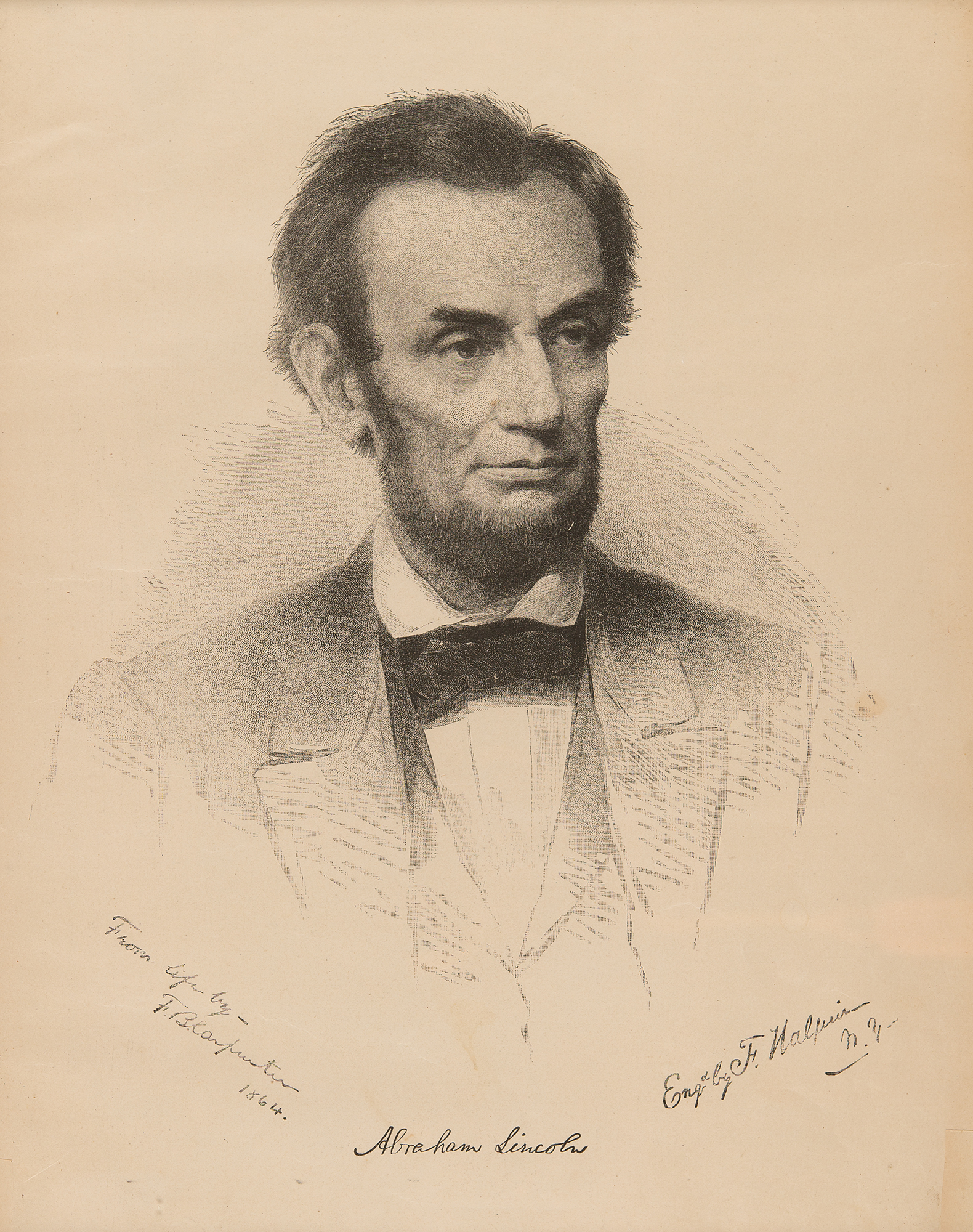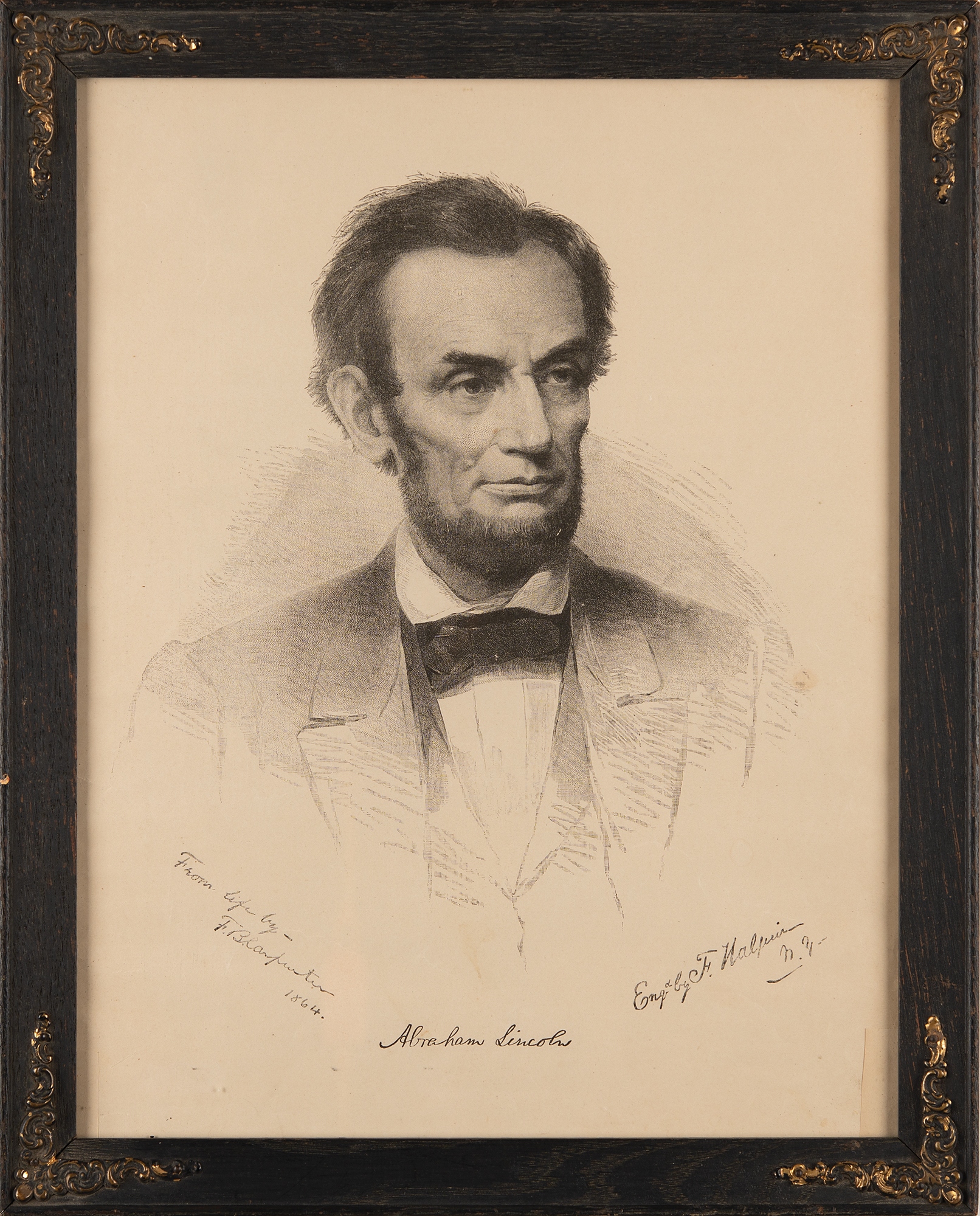 Uncommon 10.5 x 13.75 engraved portrait of Abraham Lincoln by Frederick Halpin after a painting from life by Francis Bicknell Carpenter, circa 1864, imprinted in the lower border with facsimile signatures of Halpin, Carpenter, and Lincoln. Framed to an overall size of 12.5 x 15.75. In fine condition.