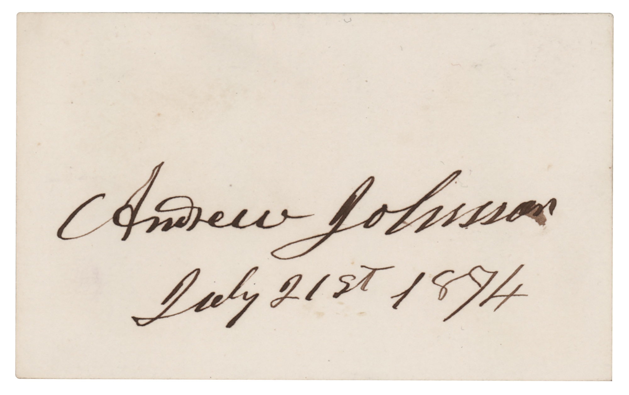 Ink signature, "Andrew Johnson,” on a white 3.5 x 2 card, dated July 21, 1874. In fine condition, with old mounting residue affecting the second signature on the reverse. Accompanied by a note that says the signature came from the autograph album of Illinois governor Shelby Cullom, and an unsigned engraving of the president.