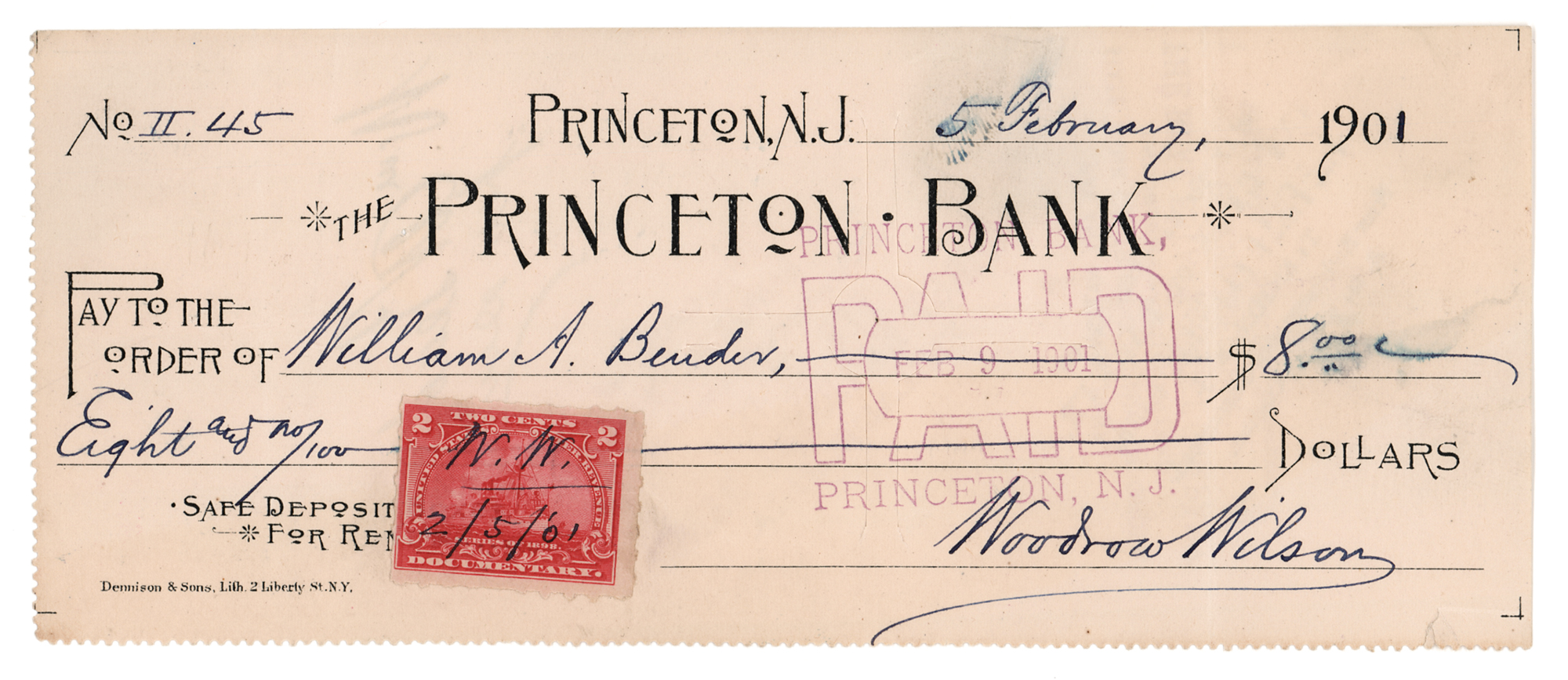 The Princeton Bank check, 7 x 3, filled out and signed by Wilson, payable to William A. Beuder for $8, February 5, 1901. In fine condition.