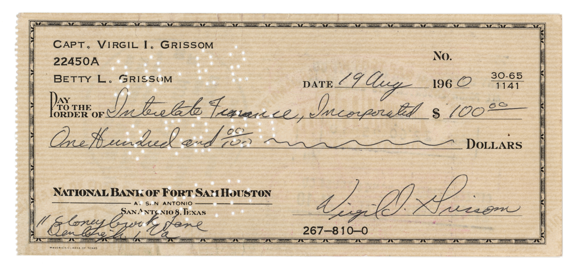 Personal check, 6.25 x 2.75, filled out and signed by Grissom, "Virgil L. Grissom," payable to Interstate Finance, Incorporated for $100, August 19, 1960. In fine condition.