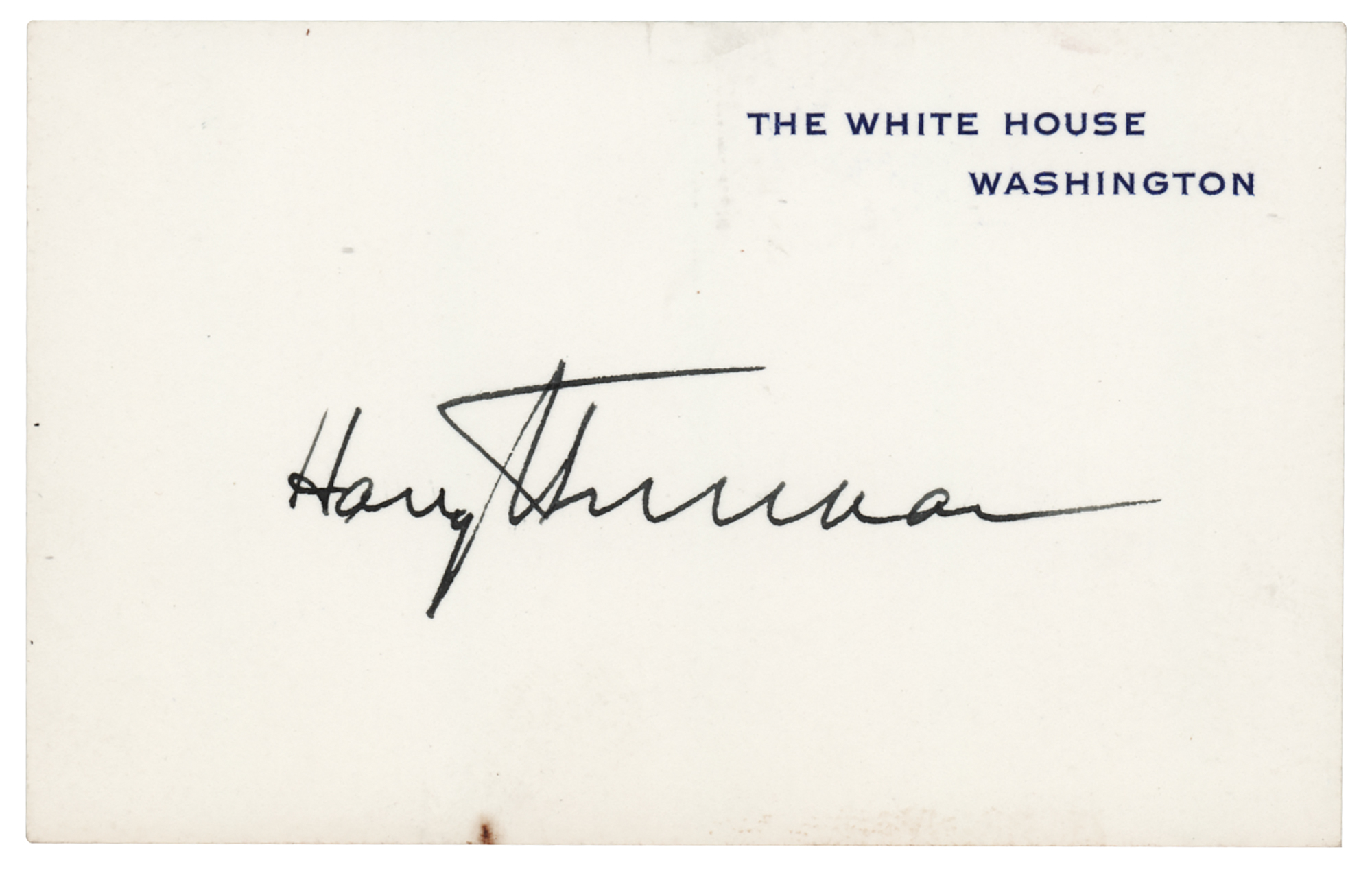 Official White House card, 4 x 2.5, neatly signed in fountain pen by Harry S. Truman. In very fine condition, with a trivial tiny stain to the bottom edge.