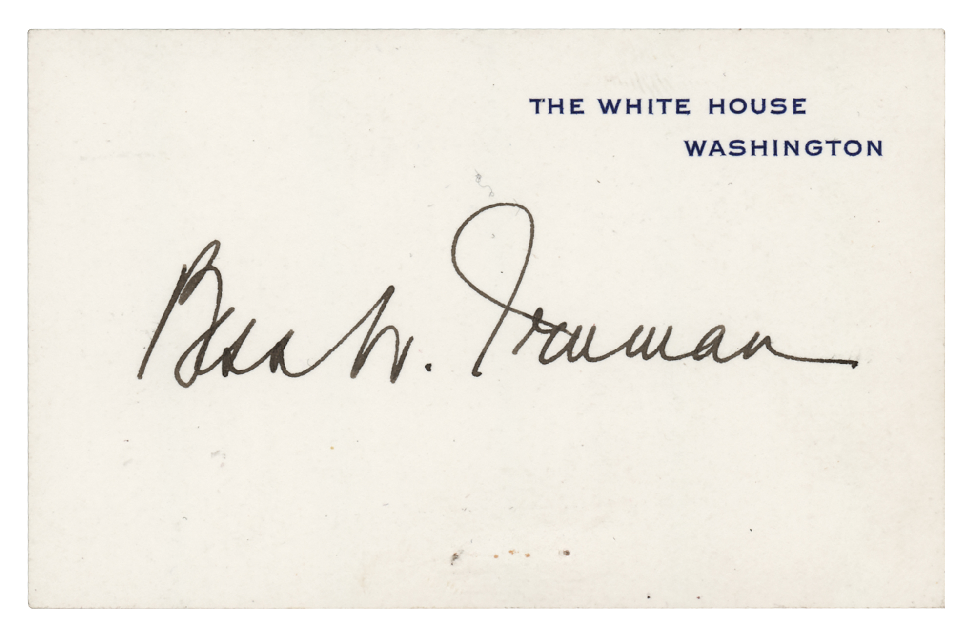 Official White House card, 4 x 2.5, neatly signed in fountain pen, "Bess W. Truman." In fine condition, with staple holes to the bottom edge.