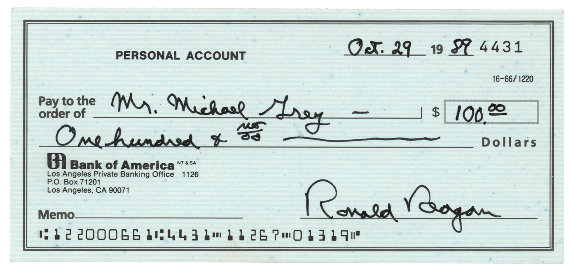 Personal check, 6 x 2.75, filled out and signed by Reagan, "Ronald Reagan," payable to Mr. Michael Grey for $100, October 29, 1989. In very fine condition. A desirable check signed by Reagan shortly after leaving the White House.