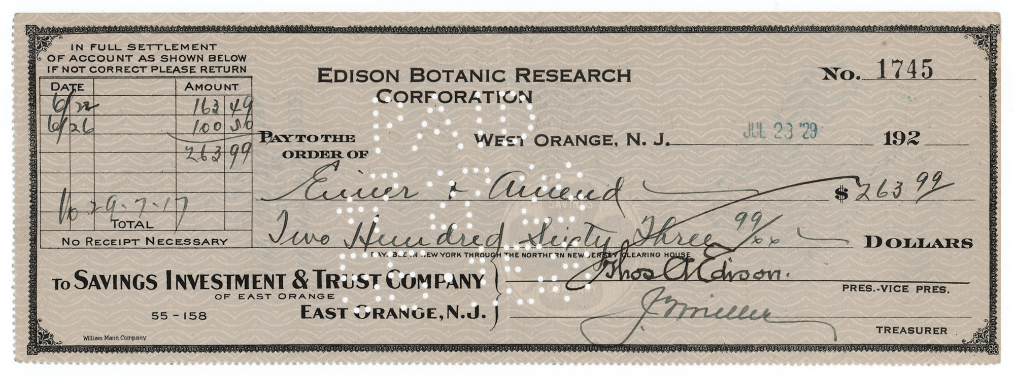 Edison Botanic Research Company business check, 8.5 x 3, filled out in another hand and signed by Edison, "Thos. A. Edison," payable to Elmer & Amend for $263.99, stamp-dated July 23, 1929. In fine condition.