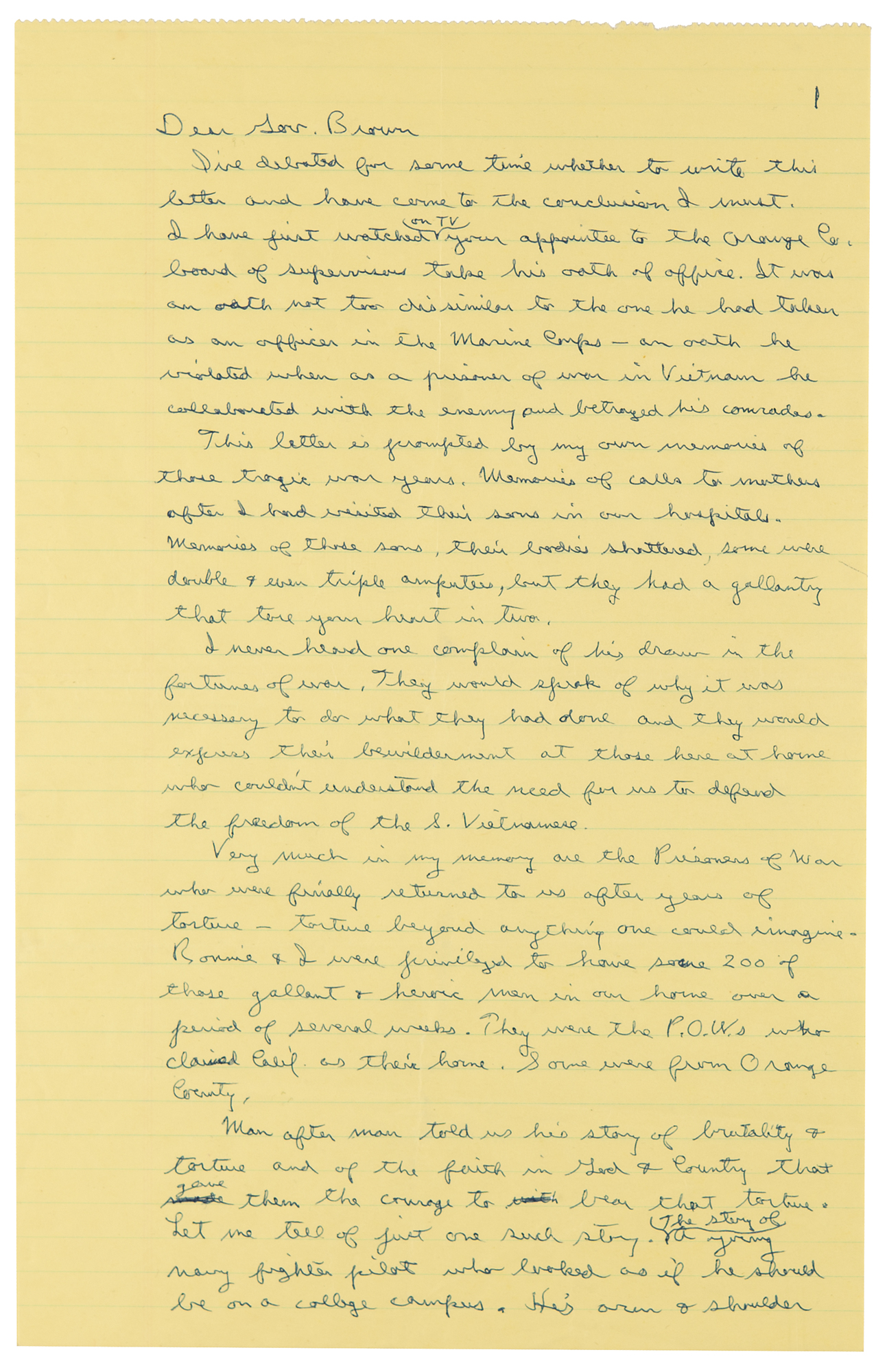 In July 1979, Governor Brown named Edison Miller, a former P.O.W. in Vietnam, to the Orange County board of supervisors. Miller had been formally censured by the Navy Department after an investigation into charges that he had collaborated with the North Vietnamese. The California Democratic establishment was livid over Brown’s choice, with State Assemblyman Richard Robinson describing Miller as ‘Hanoi’s answer to Tokyo Rose.’ Nancy Reagan publicly released 'her' letter on July 24, 1979. A fascinating draft letter from California’s ex-governor to his successor, cleverly using his wife’s name and public image to convey his own dislike for Brown’s political appointments.