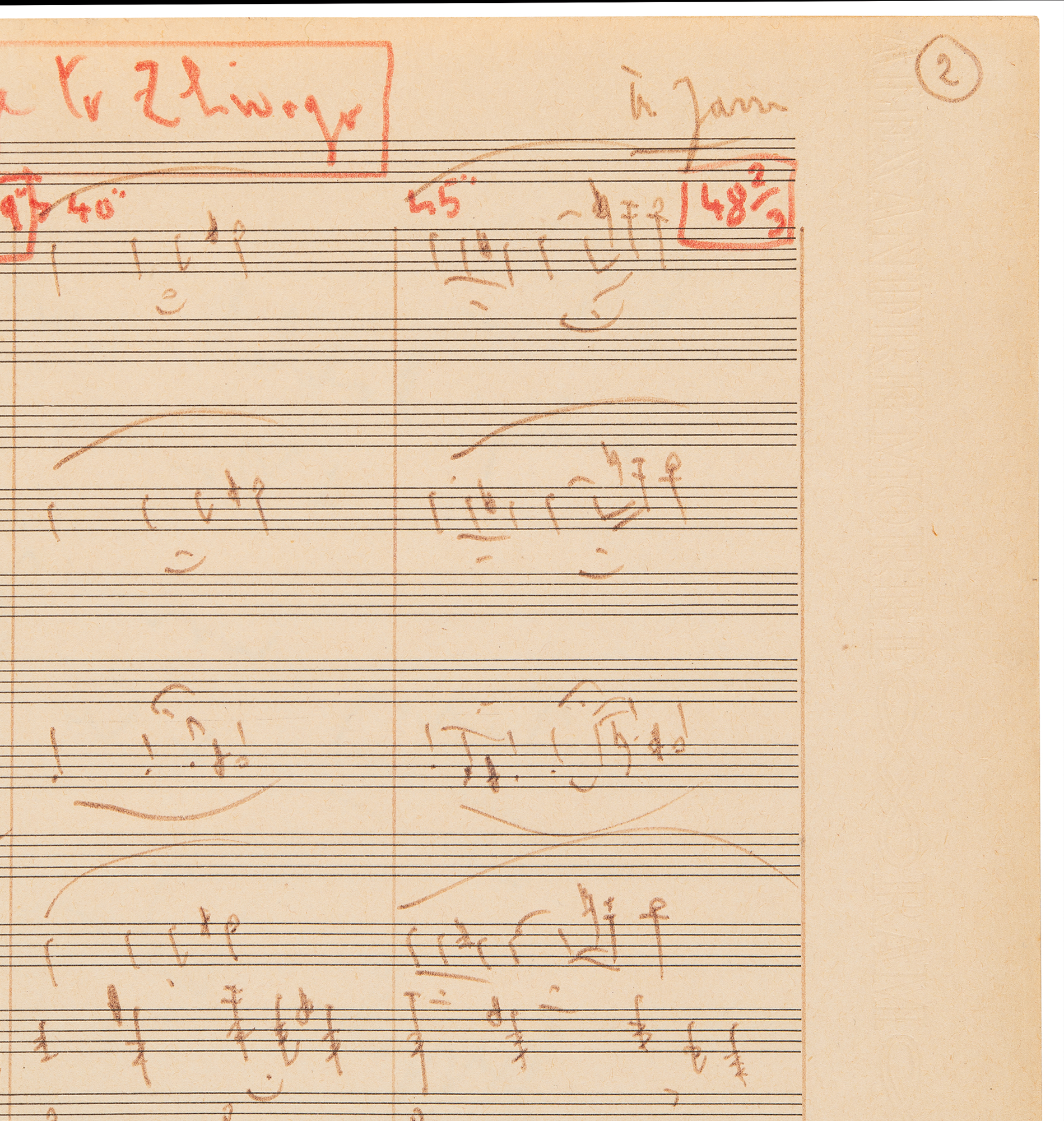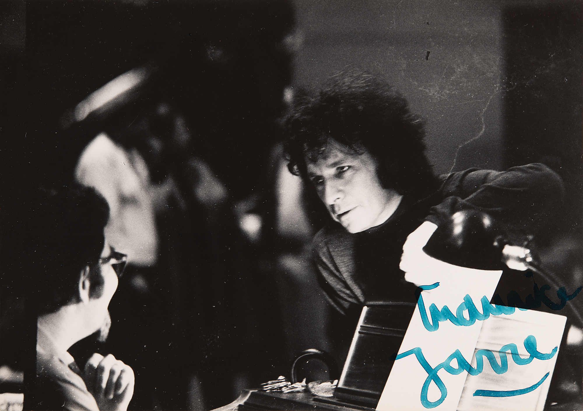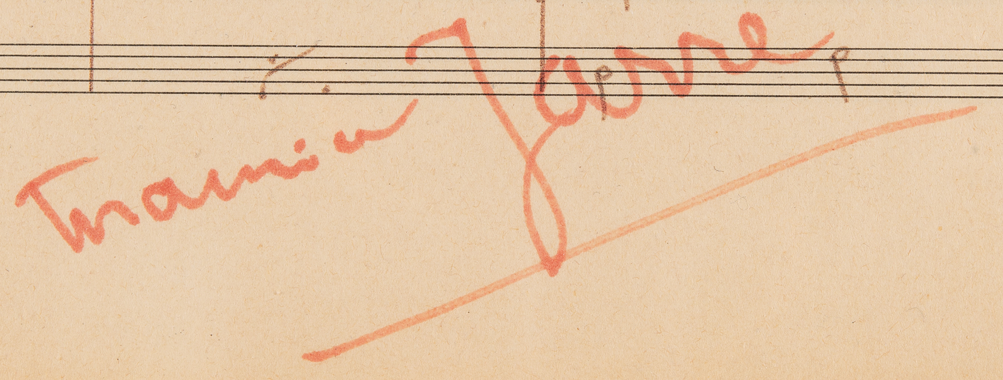 Autograph musical manuscript, signed twice, "M. Jarre" and "Maurice Jarre," one page, 10.75 x 14.25, being a fragment from 'Lara's Theme' from Doctor Zhivago (1965), headed: "Lara says goodbye to Dr. Zhivago." Fabulously executed in brown felt tip on 28-stave musically lined paper, the page from Jarre's handwritten score is annotated in various colors in the left margin to denote instrumentation. In fine condition. Accompanied by a glossy 9.75 x 6.75 photo of Jarre, signed in thick blue felt tip.