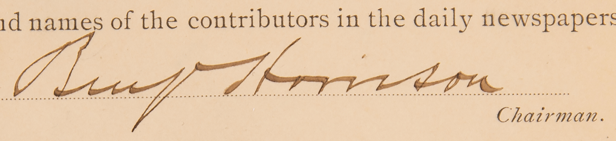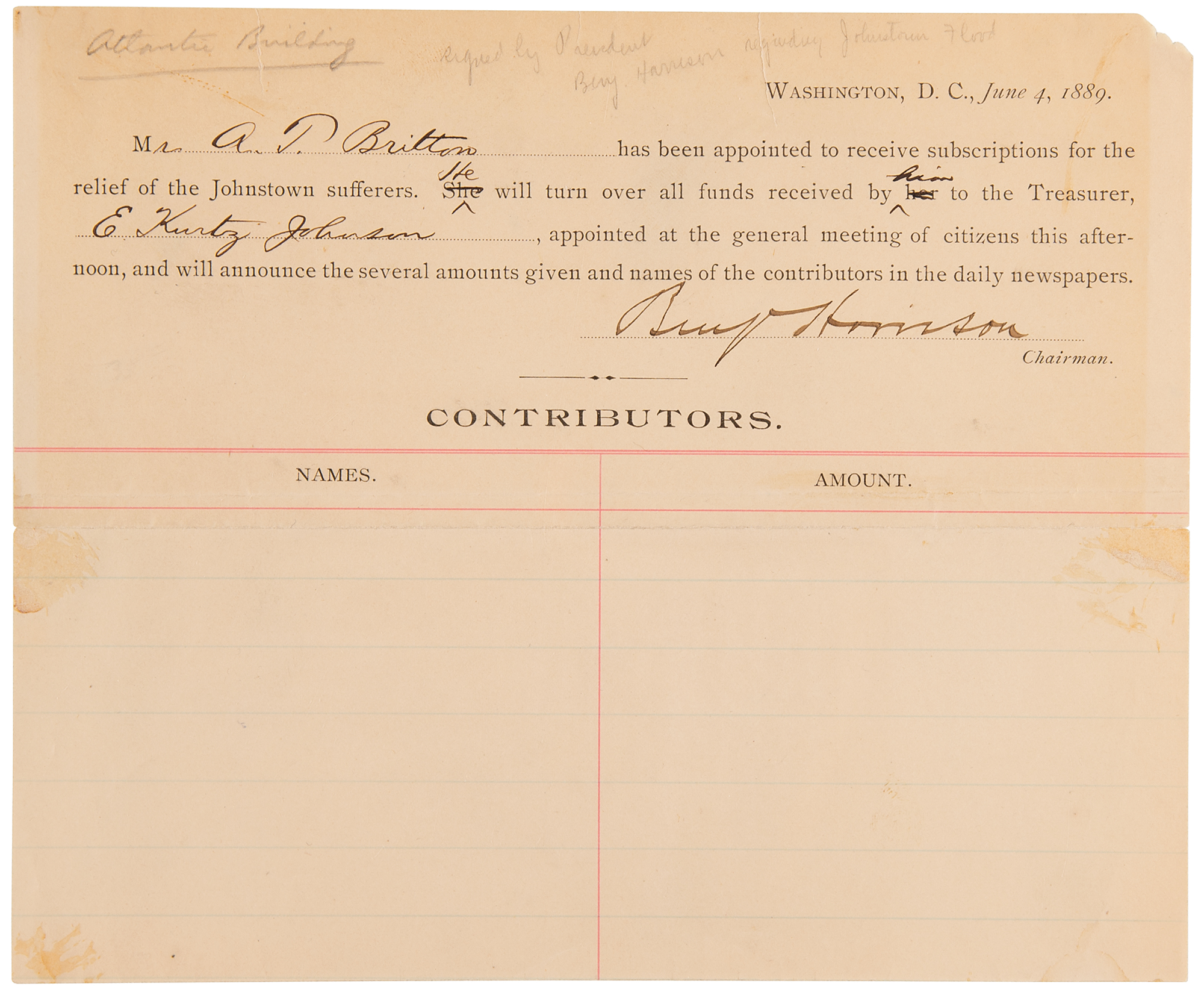 Partly-printed DS as president, signed “Benj. Harrison,” one page, 8.5 x 7, June 4, 1889. As chairman of the Johnstown Relief Committee, President Harrison certifies A. P. Britton as a fundraiser for the cause. In full: "Mr. A. P. Britton has been appointed to receive subscriptions for the relief of the Johnstown sufferers. He will turn over all funds received by him to the Treasurer, E. Kurtz Johnson, appointed at the general meeting of citizens this afternoon, and will announce the several amounts given and names of the contributors in the daily newspapers." Signed at the conclusion in ink by President Benjamin Harrison. The subscription form below has been left blank. In very good to fine condition, with some faint toning and small stains.