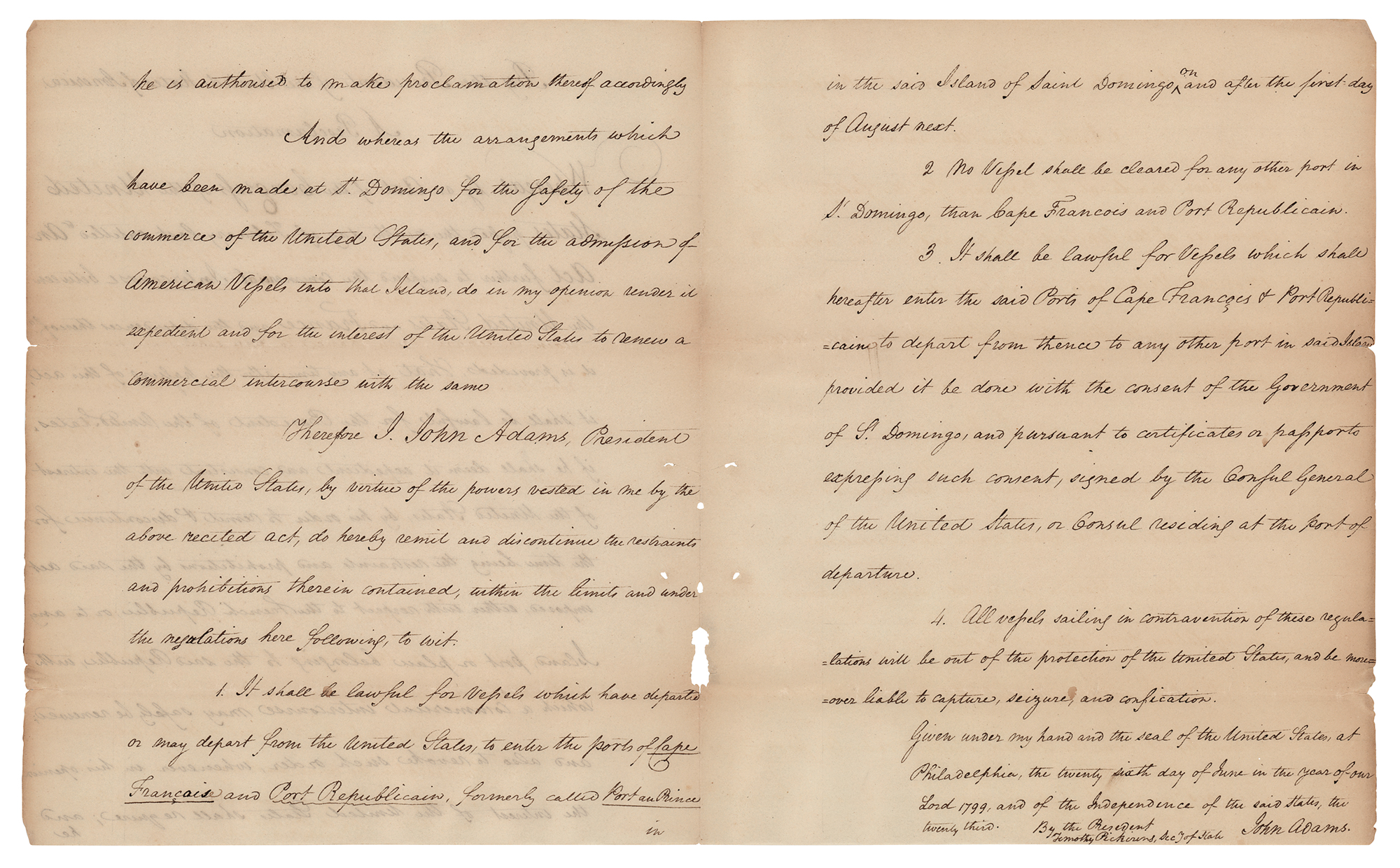 Contemporary manuscript copy of an Act of Congress restoring trade with St. Domingo (modern-day Haiti), secretarially signed for President John Adams and Secretary of State Timothy Pickering, three pages on two adjoining sheets, 8 x 9.75, June 26, 1799. Accomplished in an unknown hand, the text reads, in full: "Whereas by an Act of Congress of the United States passed the ninth day of February last, entitled 'An Act further to suspend the commercial Intercourse between the United States and France and the dependences thereof,' it is provided, that at any time after the passing of this act, it shall be lawful for the President of the United States, if he shall deem it expedient and consistent with the interest of the United States, by his order to remit & discontinue for the time being the restraints and prohibitions by the said act imposed, either with respect to the French Republic, or to any Island, port or place belonging to the said Republic, with which a commercial intercourse may be safely renewed; and also to revoke such order, whenever in his opinion the interest of the United States shall require; and he is authorised to make proclamation accordingly.