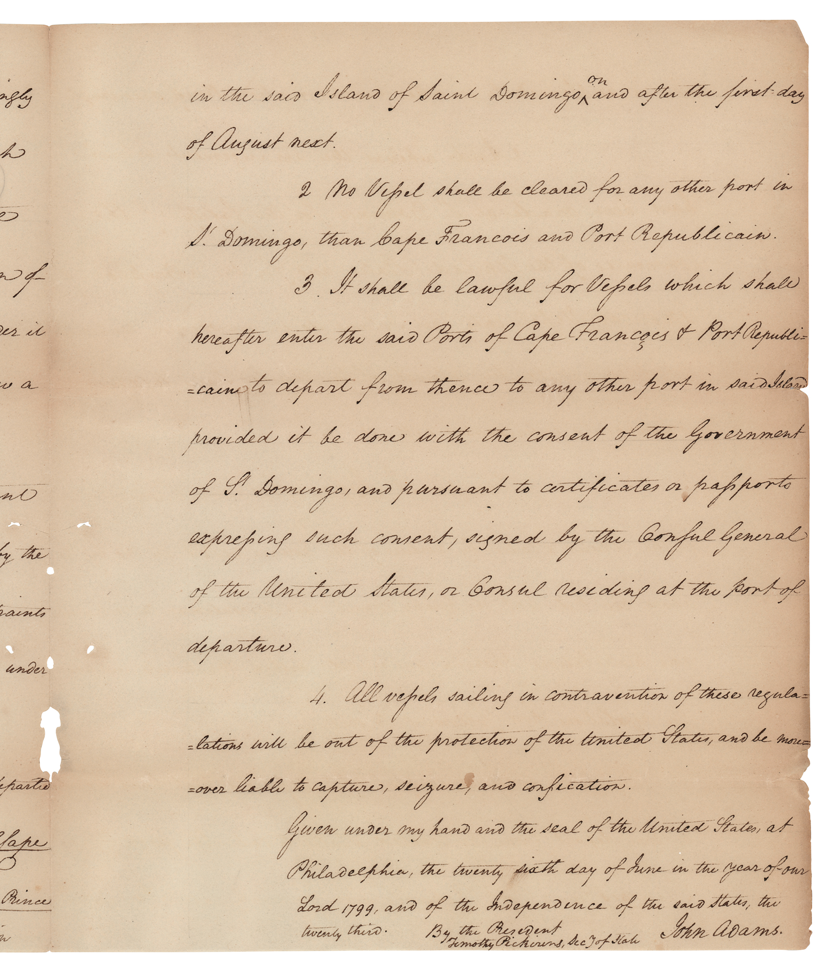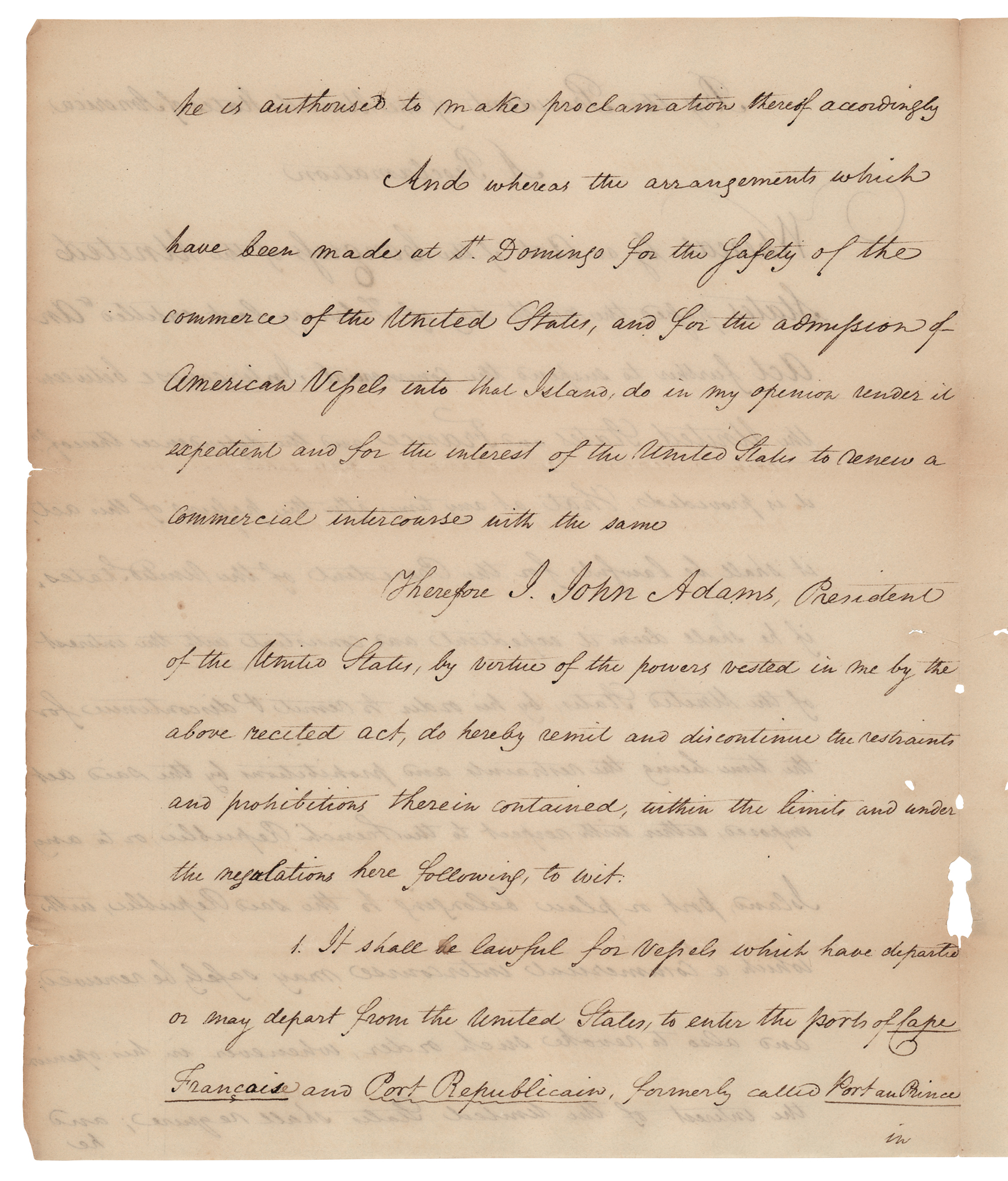 And whereas the arrangements which have been made at St. Domingo for the safety of the commerce of the United States, and for the admission of American Vessels into that Island, do in my opinion render it expedient and for the interest of the United States to renew a commercial intercourse with the same, Therefore I, John Adams, President of the United States, by virtue of the powers vested in me by the above recited act, do hereby remit and discontinue the restraints and prohibitions therein contained within the limits and under the regulations here following, to wit: