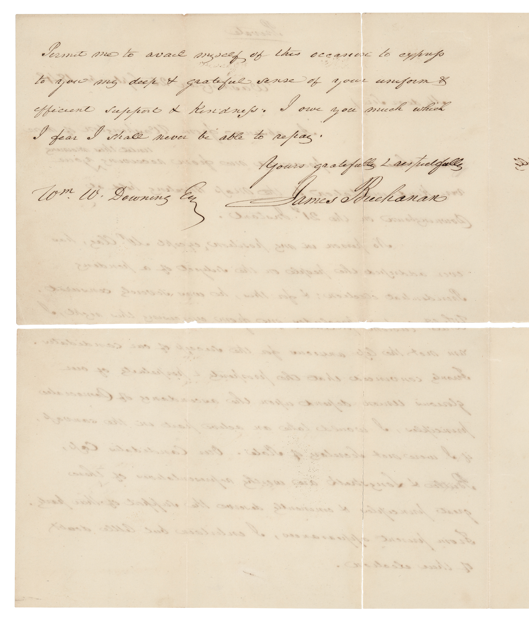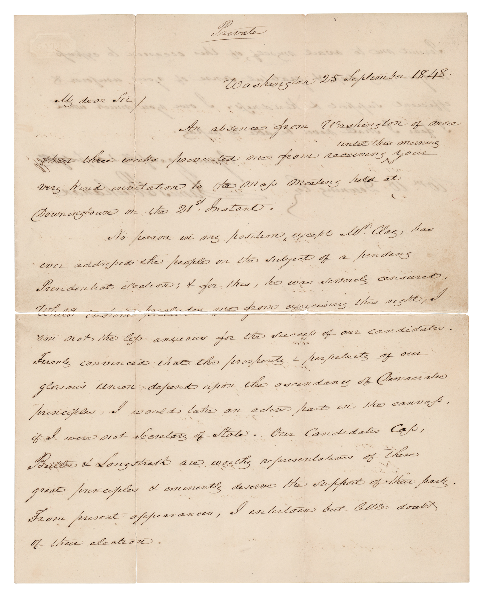 ALS, one page both sides, 8 x 10, September 25, 1848. Handwritten letter to William W. Downing, declining to endorse a candidate in the presidential election. In part: "No person in my position, except Mr. Clay, has ever addressed the people on the subject of a pending Presidential election; & for this, he was severely censured. Whilst custom precludes me from exercising this right, I am not the less anxious for the success of our candidates. Firmly convinced that the prosperity & perpetuity of our glorious union depend upon the ascendancy of Democratic principles, I would take an active part in the canvass, if I were not Secretary of State. Our Candidates Cass, Butler & Longstreth are worthy representations of these great principles & immensely deserve the support of their party. From present appearances, I entertain but little doubt of their election." In very good to fine condition, with substantial fold separations (including complete separation to the central horizontal fold) and faint toning to edges. Cass would ultimately be the Democratic Party's candidate for president in the 1848 election; he lost in a close race to Zachary Taylor of the Whig Party. A desirable, neatly penned letter on norms and decency in 19th-century American politics.