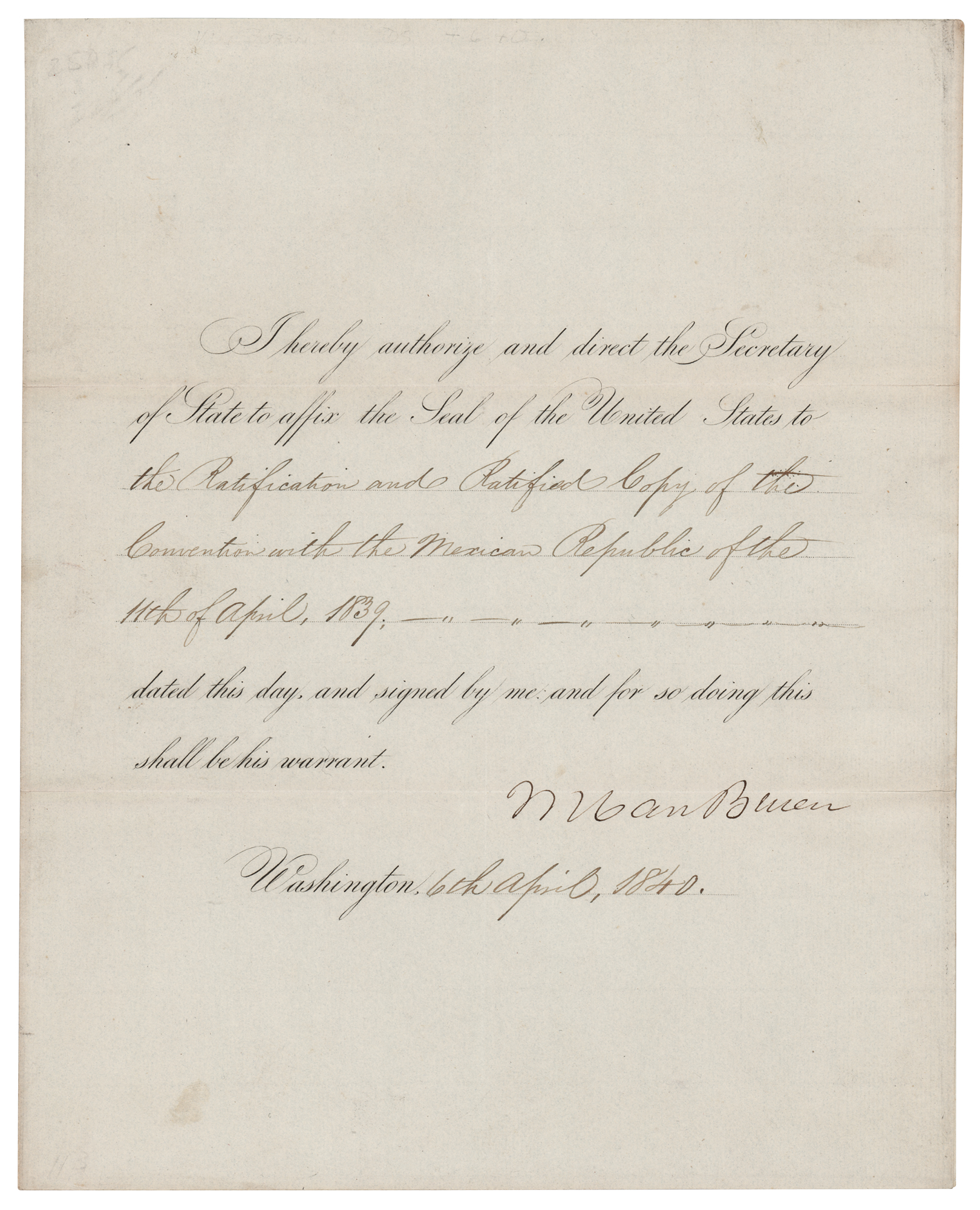 DS as president, signed “M. Van Buren,” one page, 8 x 10, April 6, 1840. President Van Buren authorizes and directs "the Secretary of State to affix the Seal of the United States to the Ratification and Ratified Copy of the Convention with the Mexican Republic of the 11th of April 1839." In fine condition.