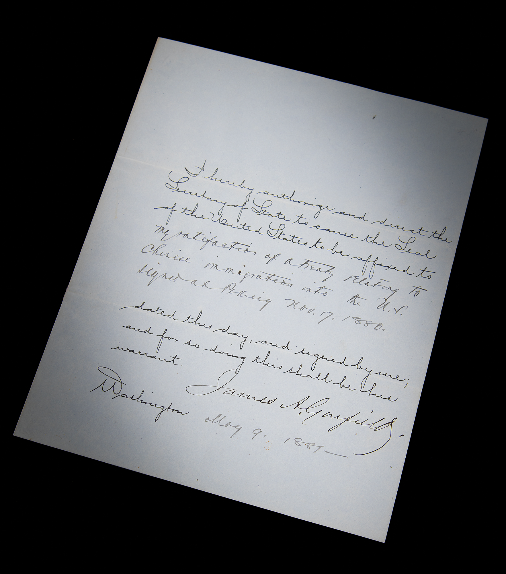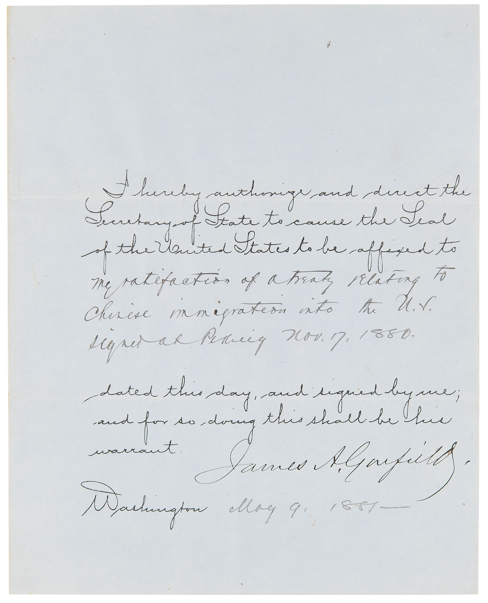Scarce partly-printed DS as president, one page, 8 x 10, May 9, 1881. President Garfield authorizes Secretary of State James G. Blaine to affix the Seal of the United States to “my ratification of a treaty relating to Chinese immigration into the U. S. signed at Peking, Nov. 17, 1880.” Boldly signed at the conclusion by President James A. Garfield. In fine condition.