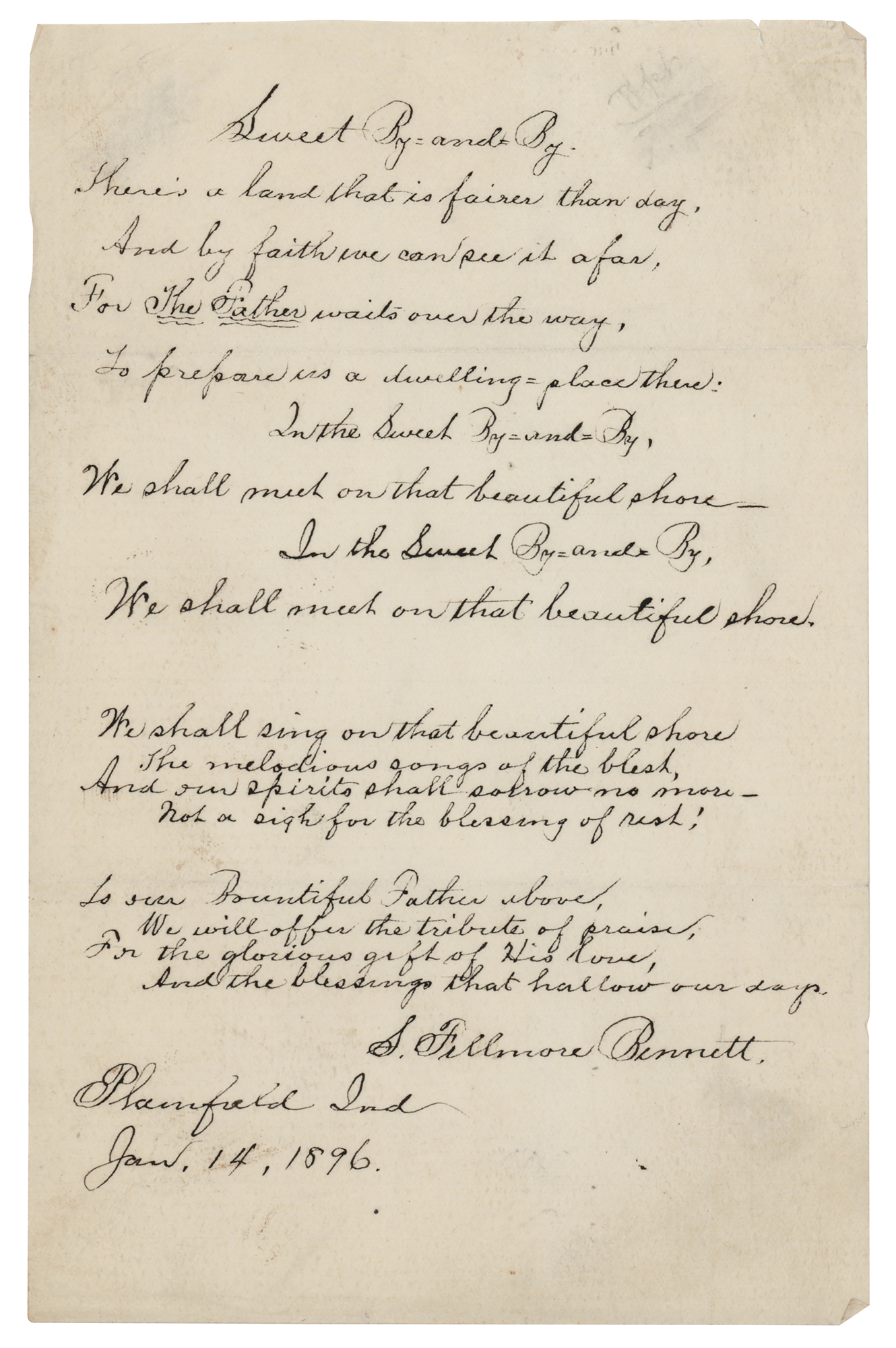 American lyricist (1836-1898) best known for the hymn 'In the Sweet By-and-By.' Autograph lyrics signed “S. Fillmore Bennett,” one page, 5 x 7.5, January 14, 1896. Handwritten lyrics to the Christian hymn "Sweet By-and-By," beginning: "There's a land that is fairer than day, / And by faith we can see it afar, / For the Father waits over the way, / To prepare us a dwelling-place there: / In the Sweet By-and-By, / We shall meet on that beautiful shore— / In the Sweet By-and-By, / We shall meet on that beautiful shore." In fine condition.