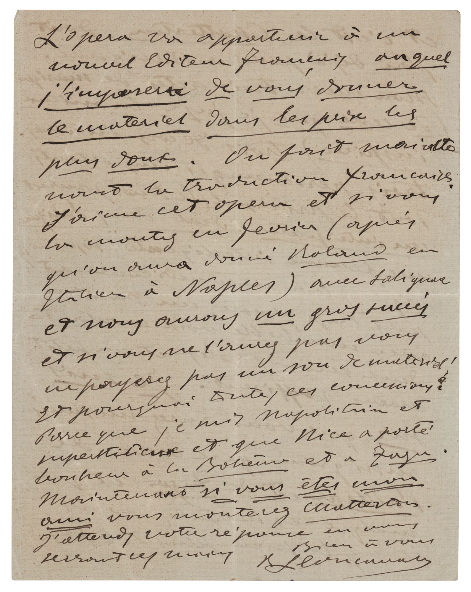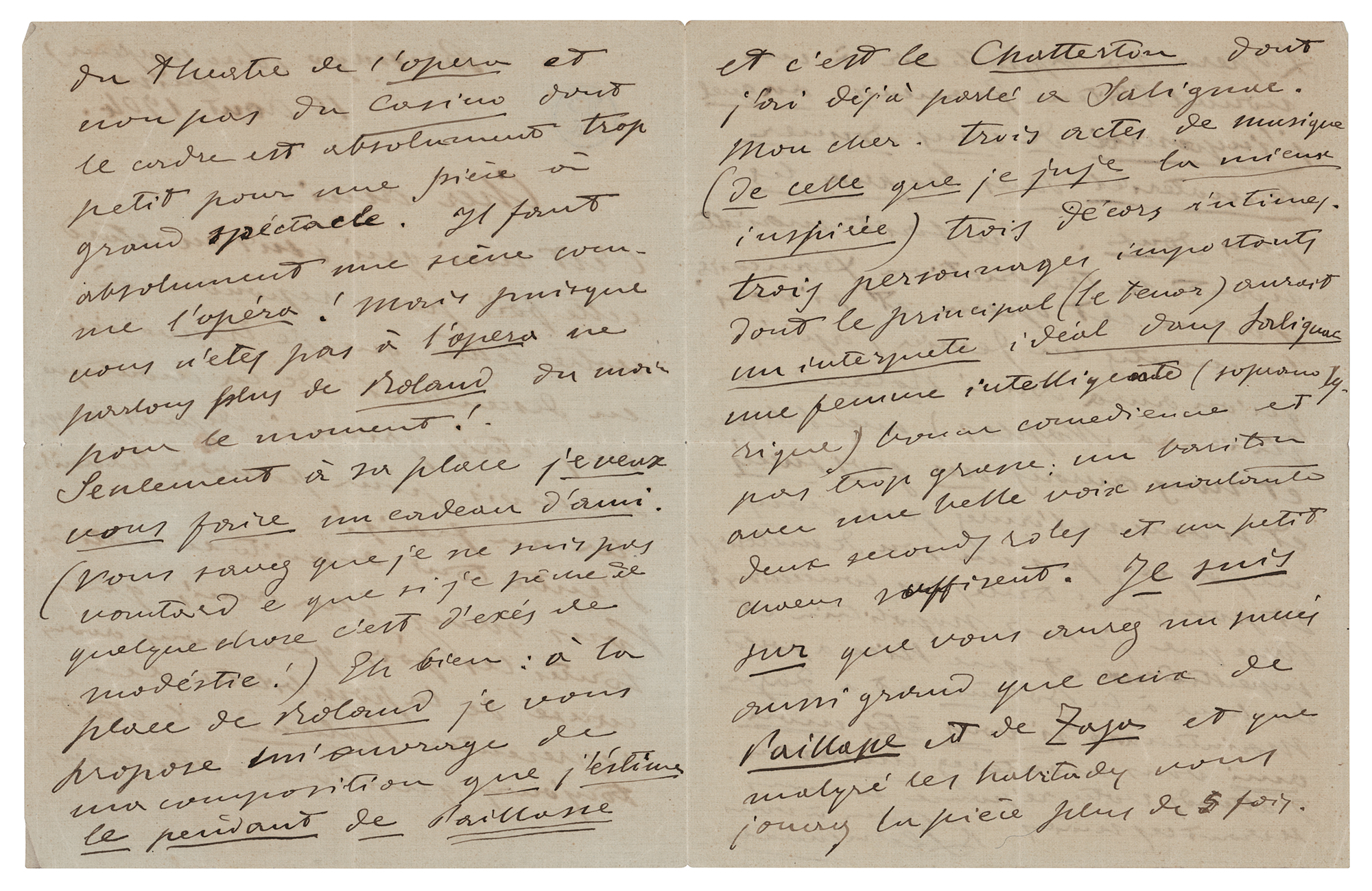 Italian composer (1857–1919) best known for his operas, particularly the beloved repertoire staple 'Pagliacci.' ALS in French, signed “R. Leoncavallo,” four pages on two adjoining sheets, 5.75 x 7.25, personal monogrammed letterhead, August 10, 1904. Handwritten letter to an impresario at Nice, France, about his opera "Chatterton," suggesting that he stage it rather than "Roland," as it is better suited to the intimate stage of the Casino at Nice. Leoncavallo expounds on the opera's merits, calling it "a composition that I consider the counterpart of Paillasse [Pagliacci]…three acts of music (of the kind that I consider the most inspired), three intimate settings, three important characters." He gives details of the vocal requirements and emphasizes the suitability of the lead role for the tenor Thomas Salignac. In fine condition. Leoncavallo's first opera, Chatterton, composed in about 1876, was indeed revived at Nice in a revised form on April 7, 1905.