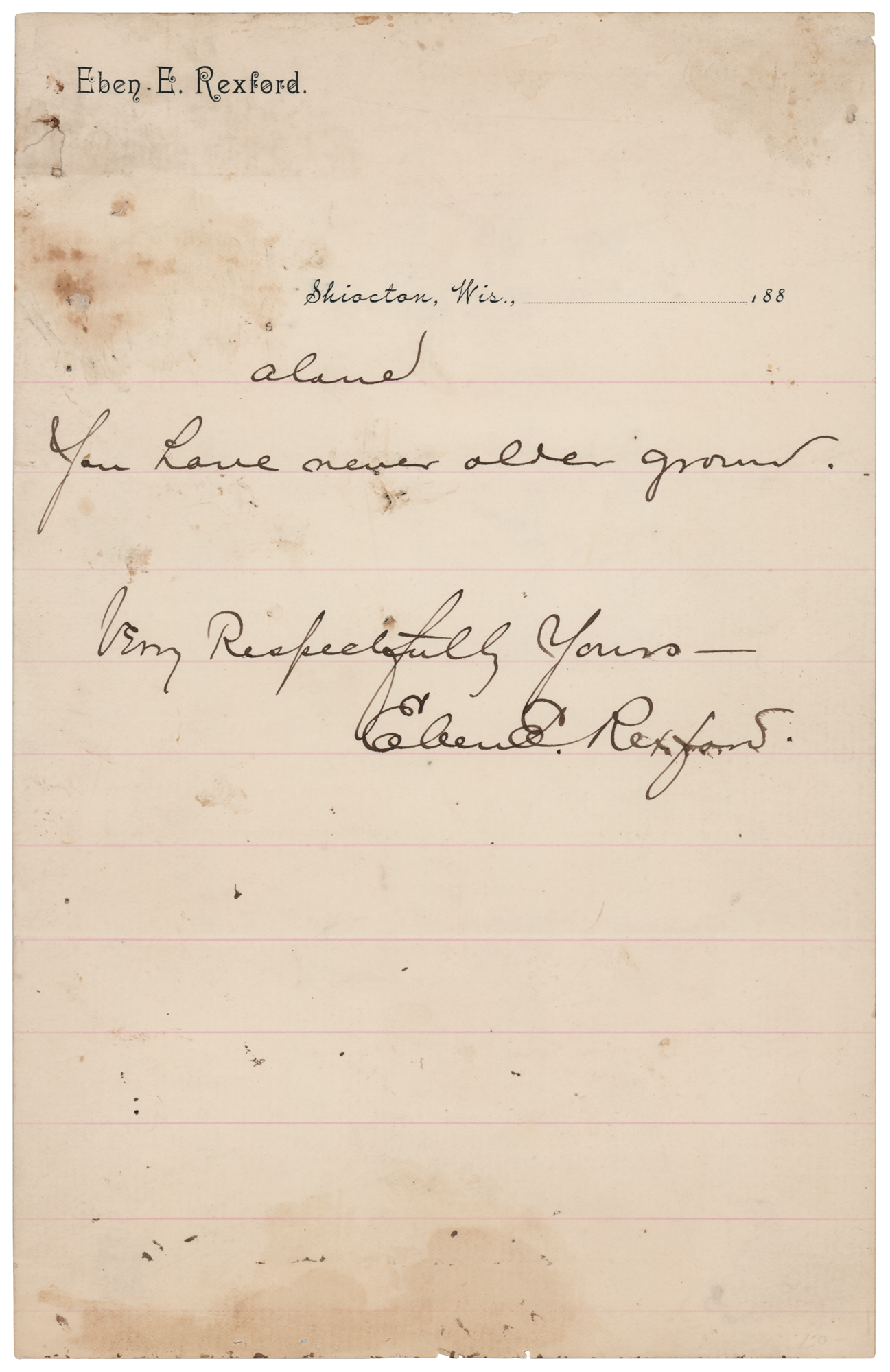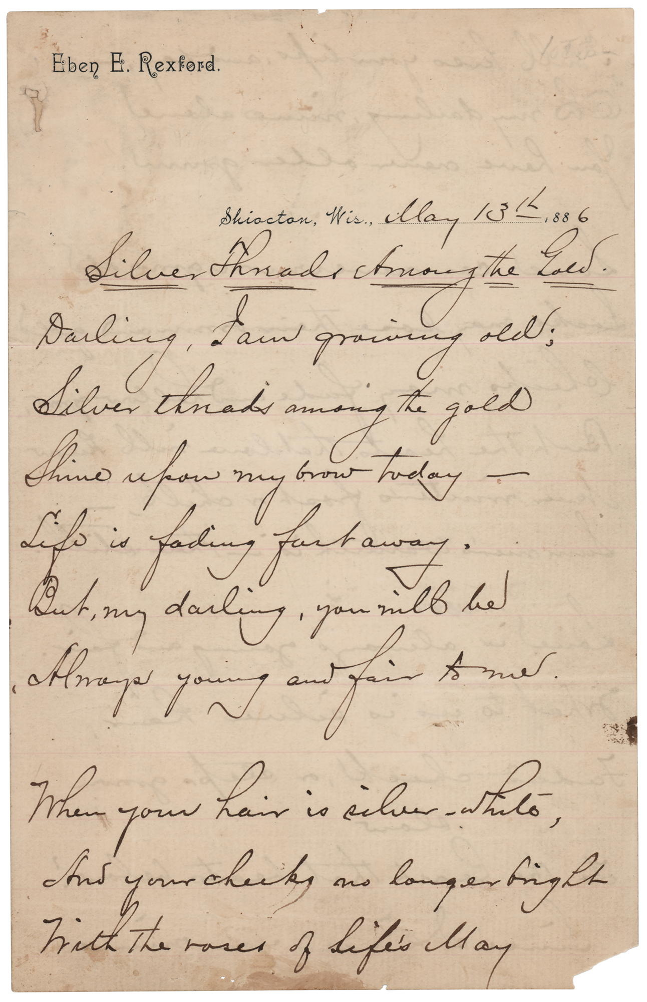 American writer and poet (1848–1916) known for authoring the lyrics to several popular and gospel songs. Autograph lyrics signed “Very respectfully yours, Eben E. Rexford,” three pages on two sheets, 5.75 x 9, May 13, 1886. Handwritten lyrics to his popular song "Silver Threads Among the Gold," beginning: "Darling, I am growing old, / Silver threads among the gold / Shine upon my brow today— / Life is fading fast away. / But, my darling, you will be, will be / Always young and fair to me." In very good to fine condition, with scattered stains, a tack hole to the upper left corner, and chip to the lower right corner.