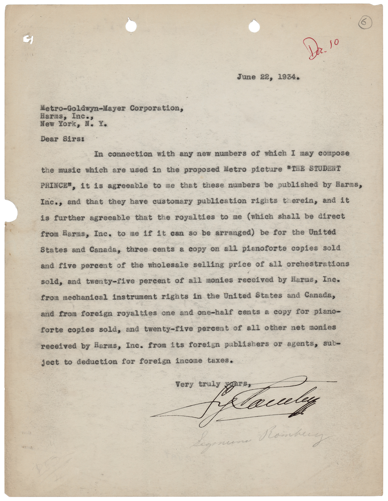 TLS, one page, 8.5 x 11, June 22, 1934. Letter to the Metro-Goldwyn-Mayer Corporation, in full: "In connection with any new numbers of which I may compose the music which are used in the proposed Metro picture 'The Student Prince,' it is agreeable to me that these numbers be published by Harms, Inc., and that they have customary publication rights therein, and it is further agreeable that the royalties to me (which shall be direct from Harms, Inc. to me if it can so be arranged) be for the United States and Canada, three cents a copy on all pianoforte copies sold and five percent of the wholesale selling price of all orchestrations sold, and twenty-five percent of all monies received by Harms, Inc. from mechanical instrument rights in the United States and Canada, and from foreign royalties one and one-half cents a copy for pianoforte copies sold, and twenty-five percent of all other net monies received by Harms, Inc. from its foreign publishers or agents, subject to deduction for foreign income taxes." In fine condition, with minor paper loss to the left edge. The 1954 MGM musical The Student Prince, adapted from Romberg's 1924 operetta of the same name, starred Ann Blyth, Edmund Purdom, John Ericson, Louis Calhern, Edmund Gwenn, S. Z. Sakall, and Betta St. John.