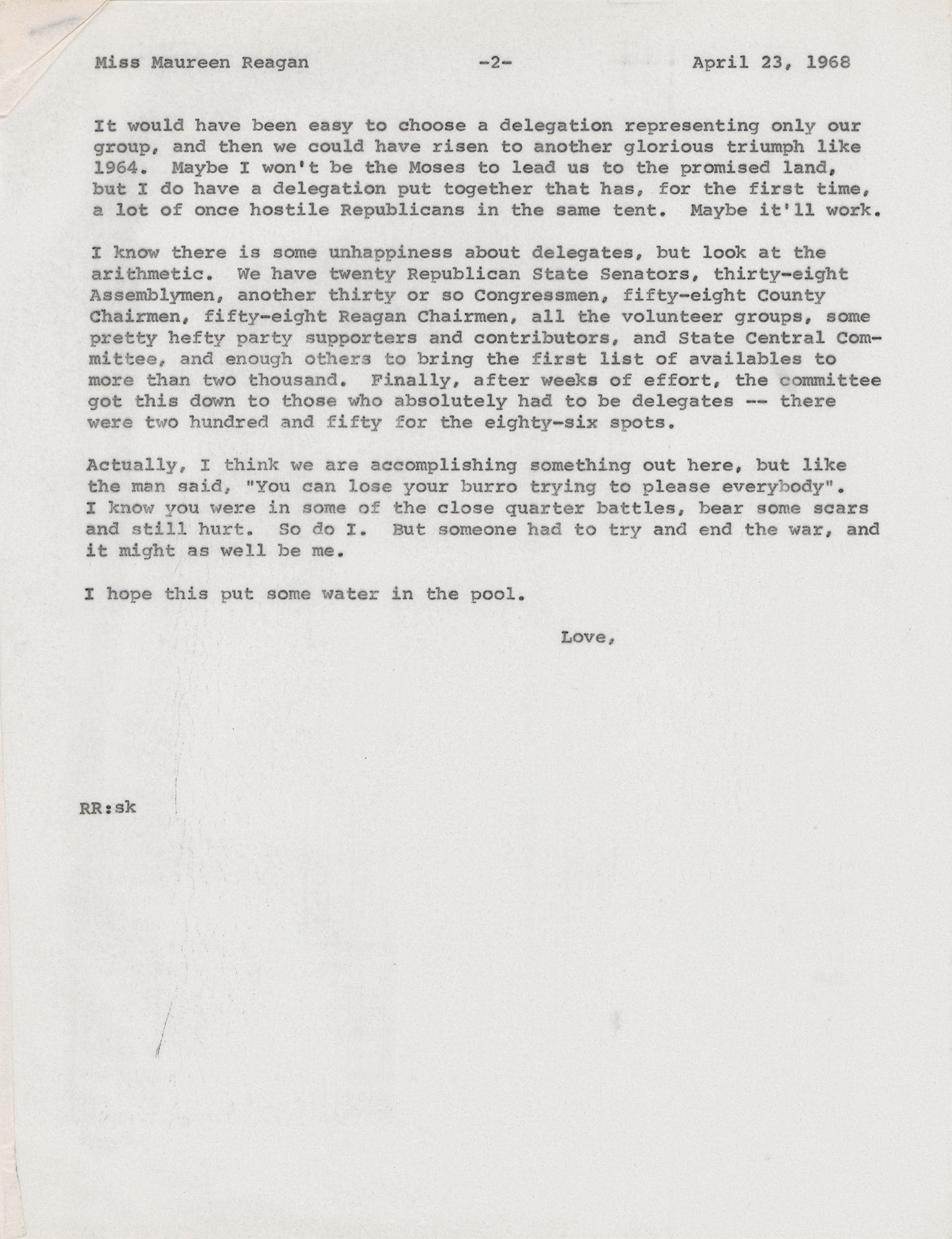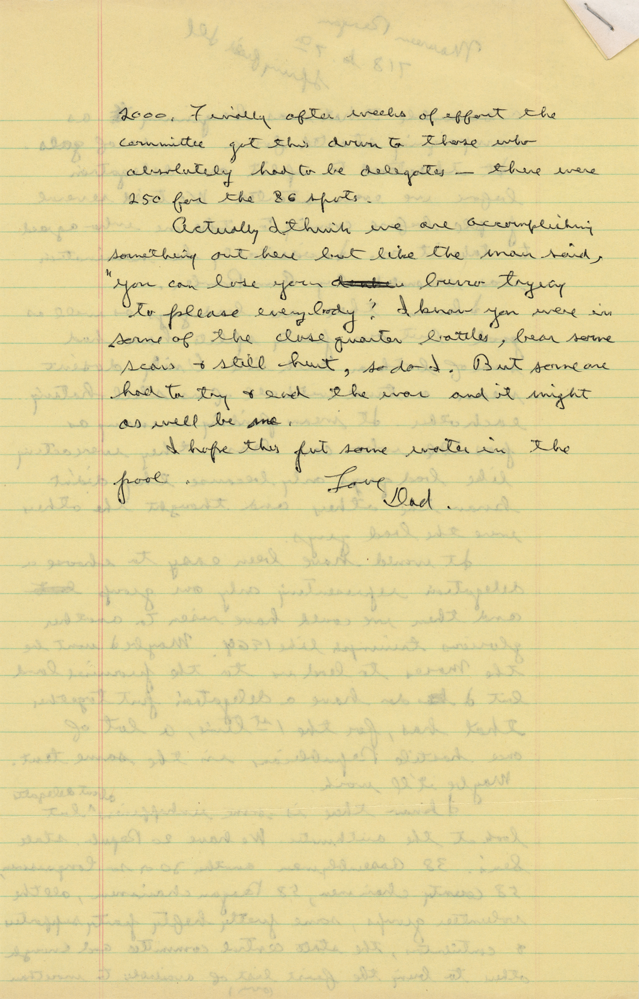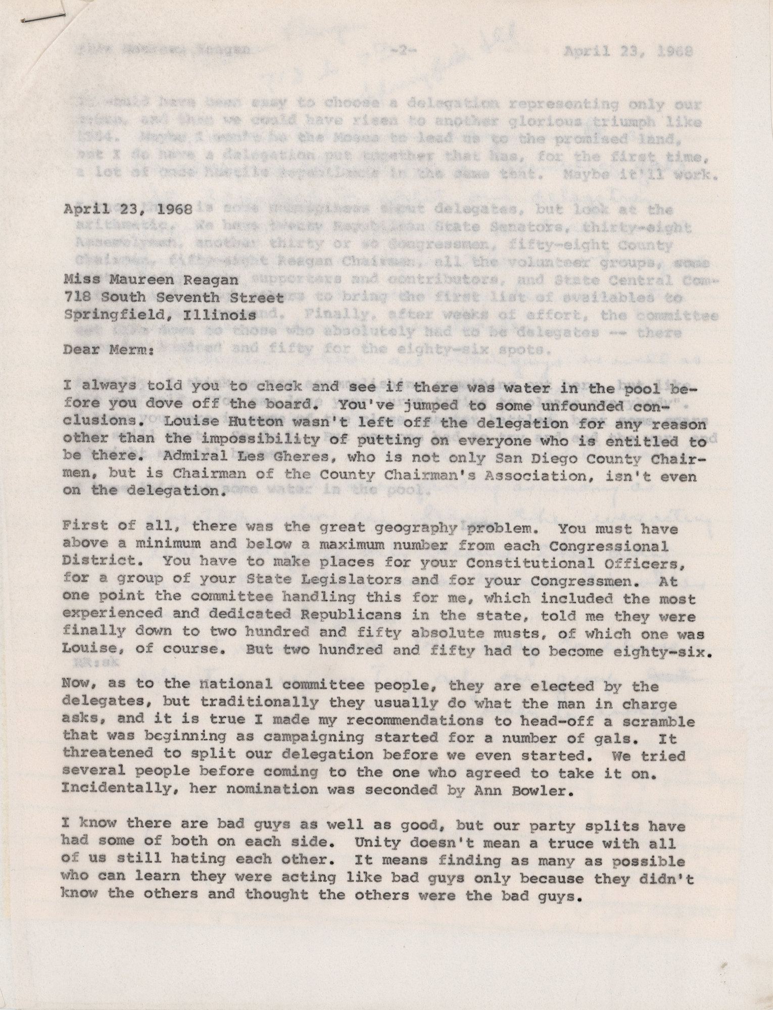 Draft ALS signed “Love, Dad,” one page both sides, 8 x 12.5, April 23, 1968. Partial handwritten draft of a letter to his daughter, Maureen, offering an explanation as to why a friend was not made a Republican delegate. In full: "…a scramble that was beginning as campaigning started for a number of gals. It threatened to split our delegation before we even started. We tried several people before coming to the one who agreed to take it on. Incidentally her nomination was seconded by Ann Bowler. I know there are bad guys as well as good but our party splits have had some of both on each side. Unity doesn't mean a truce with all of us still hating each other. It means finding as many as possible who can learn they were acting like bad guys only because they didn't know the others and thought the others were the bad guys.