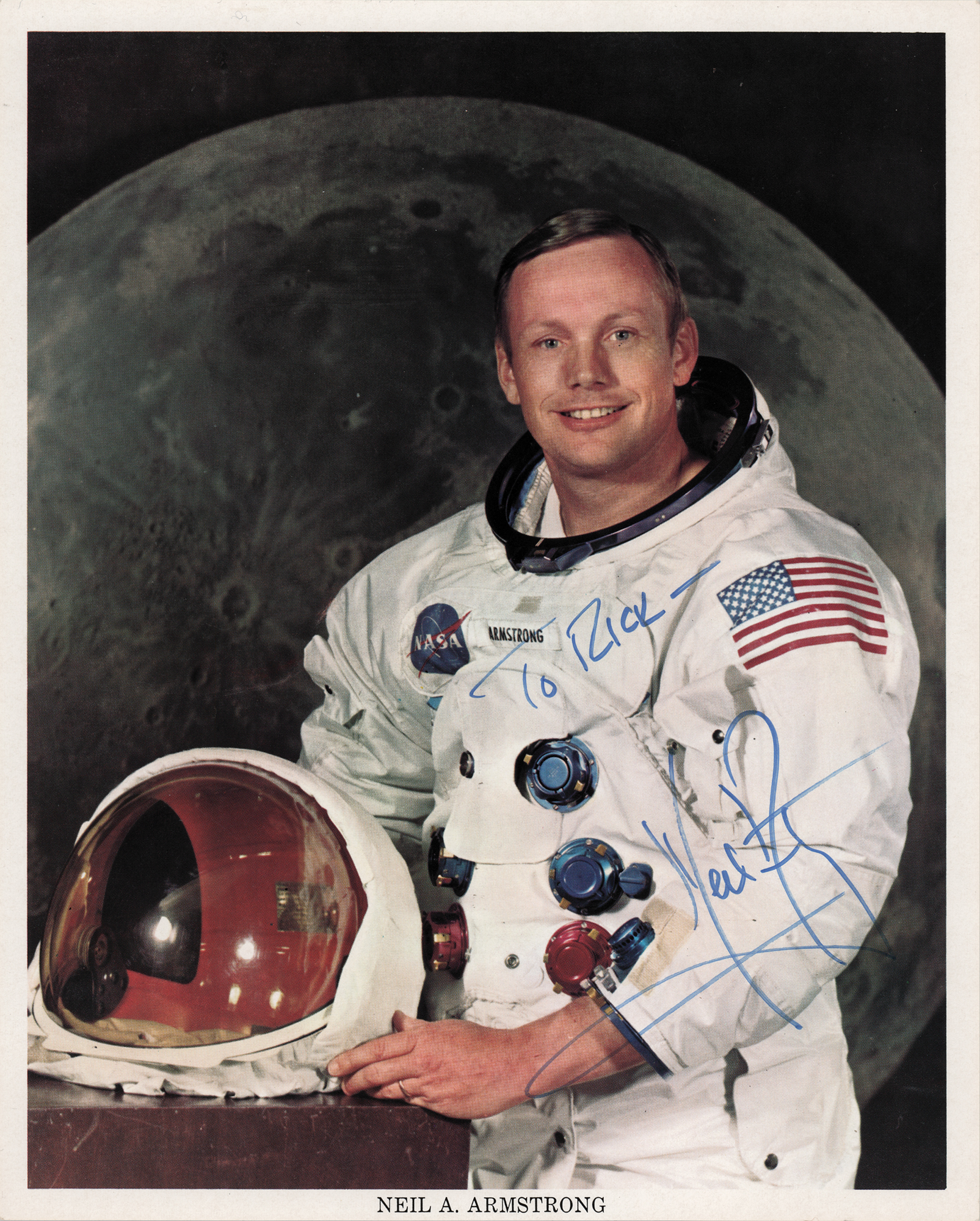 Official color 8 x 10 NASA lithograph of Neil Armstrong in his white space suit against a lunar backdrop, signed and inscribed in blue felt tip, "To Rick—Best wishes, Neil Armstrong." In fine condition.