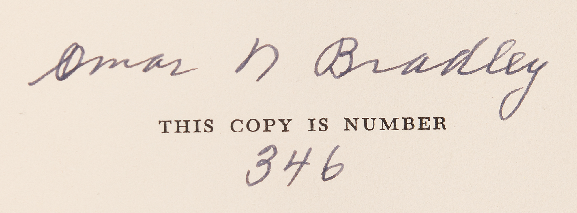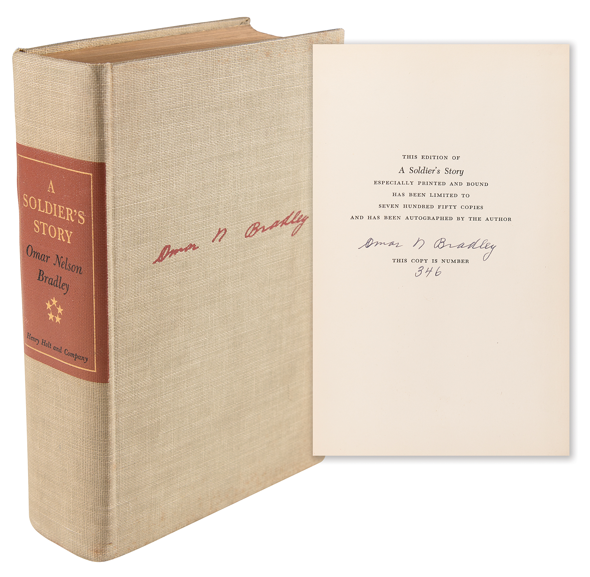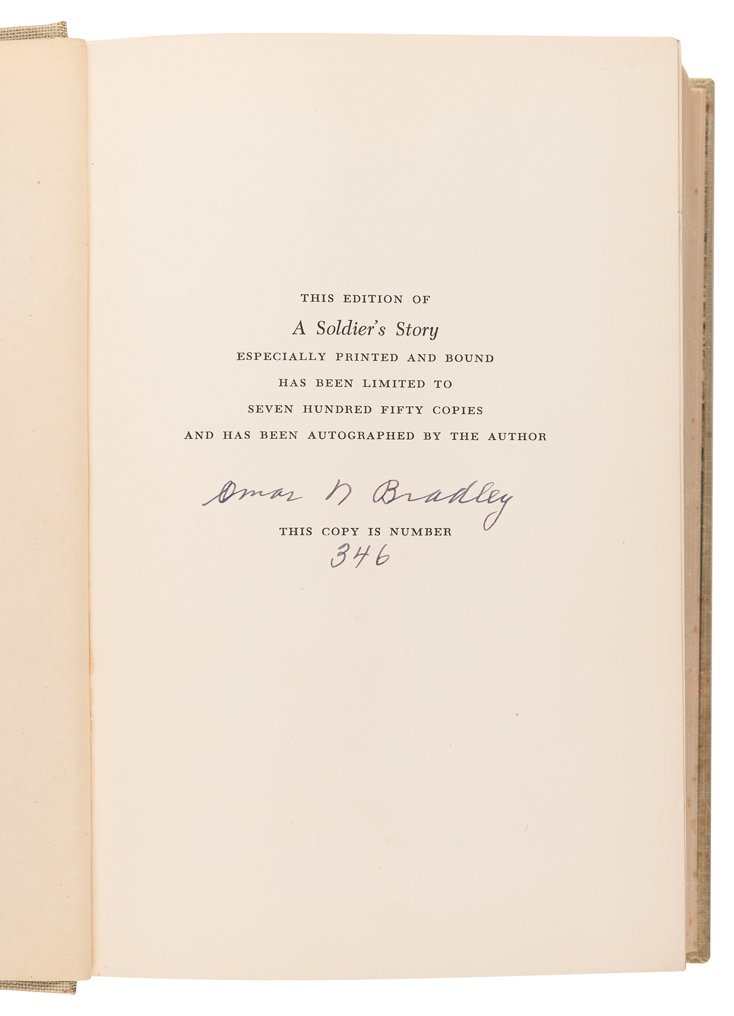 Signed book: A Soldier's Story. First edition, limited issue, numbered 346/750. NY: Henry Holt and Company, 1951. Hardcover, 6.25 x 9.25, 618 pages. Signed on the colophon in black ballpoint, "Omar N. Bradley." In fine condition, with light foxing and soiling to the covers. Accompanied by a custom-made clamshell case.