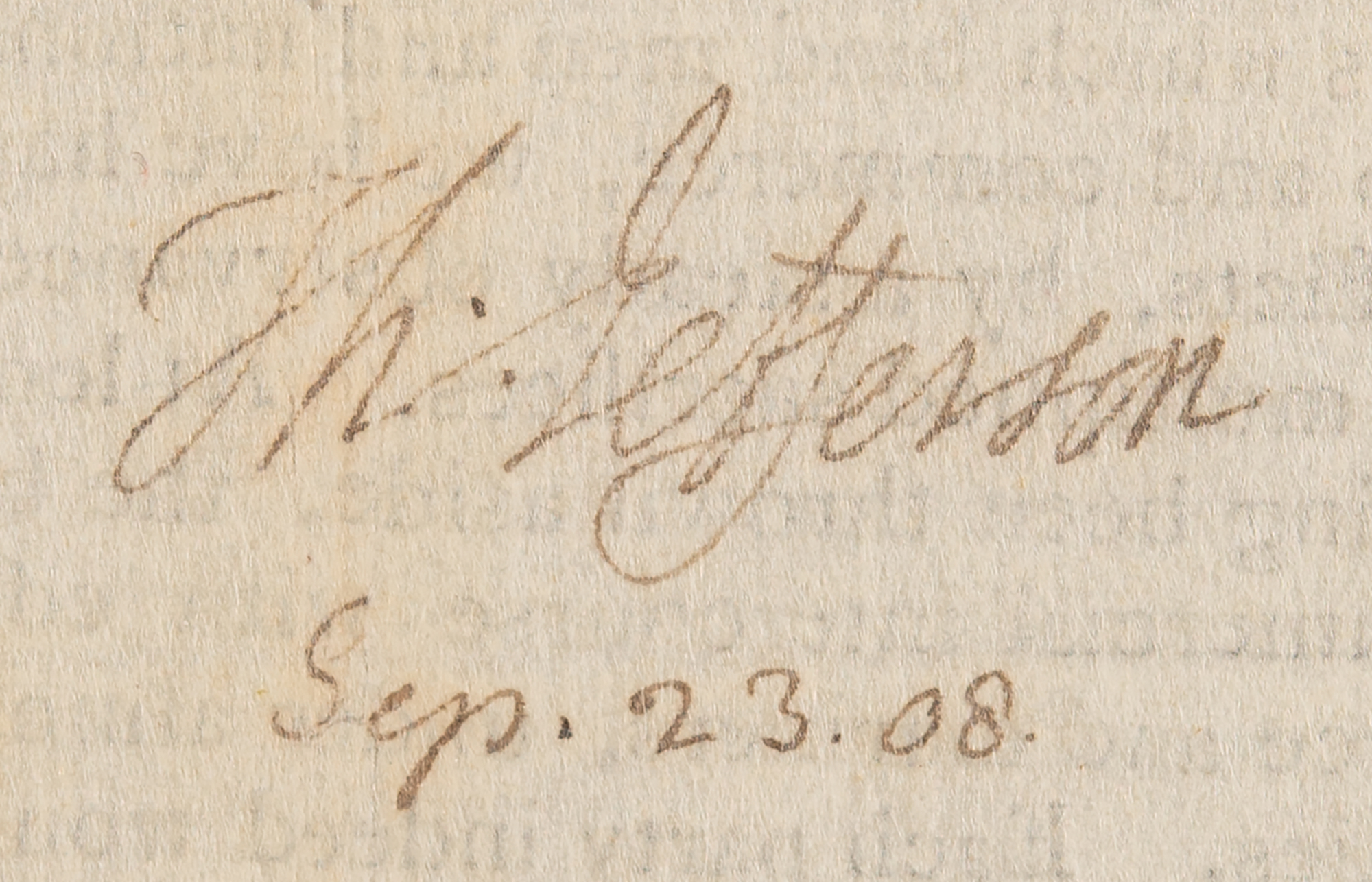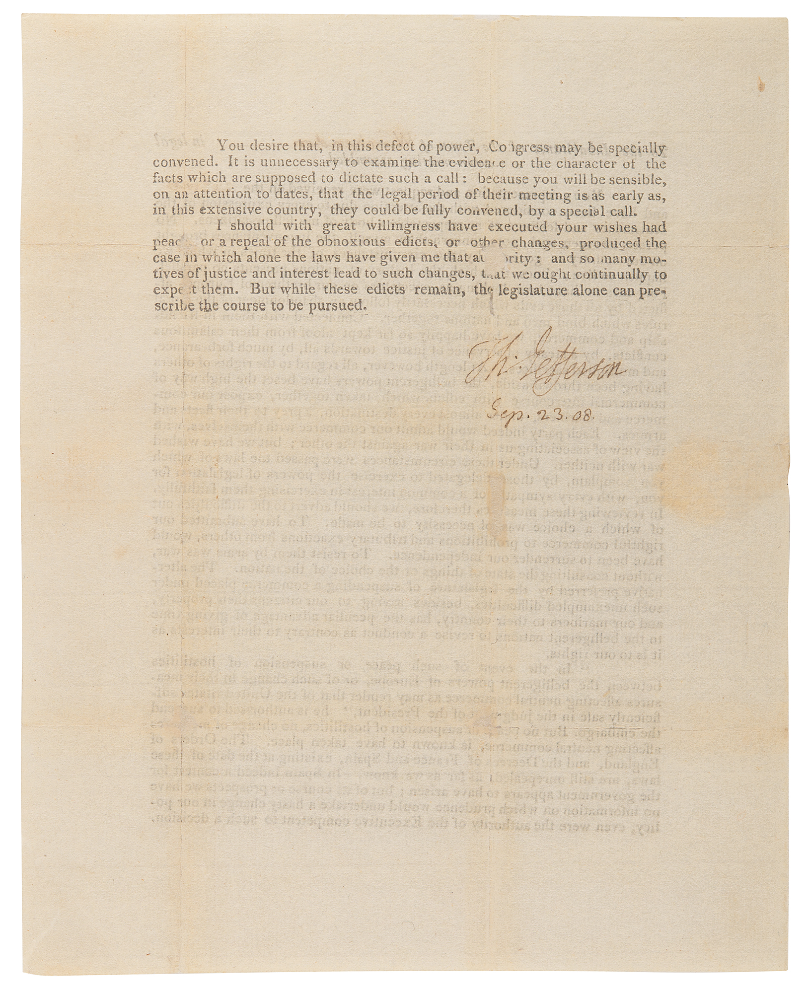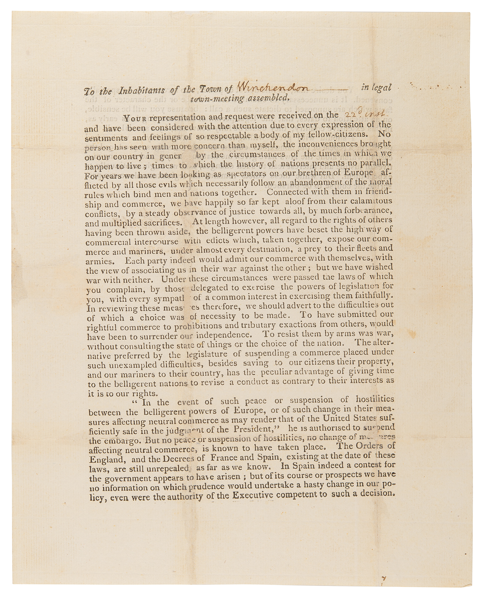 LS as president, signed “Th: Jefferson,” one page both sides, 8 x 9.75, September 23, 1808. Partly-printed letter to the "Inhabitants of the Town of Winchendon, in legal town-meeting assembled," addressing concerns raised about the Embargo Act of 1807. In part: "No person has seen with more concern than myself, the inconveniences brought on our country…by the circumstances of the times in which we happen to live….For years we have been looking as spectators on our brethren of Europe, afflicted by all those evils which necessarily follow an abandonment of the moral rules which bind men and nations together. Connected with them in friendship and commerce, we have happily so far kept aloof from their calamitous conflicts….At length however, all regard to the rights of others having been thrown aside, the belligerent powers have beset the high way of commercial intercourse with edicts which…expose our commerce and mariners…a prey to their fleets and armies. Each party indeed would admit our commerce with themselves, with the view of associating us in their war against the other; but we have wished war with neither."